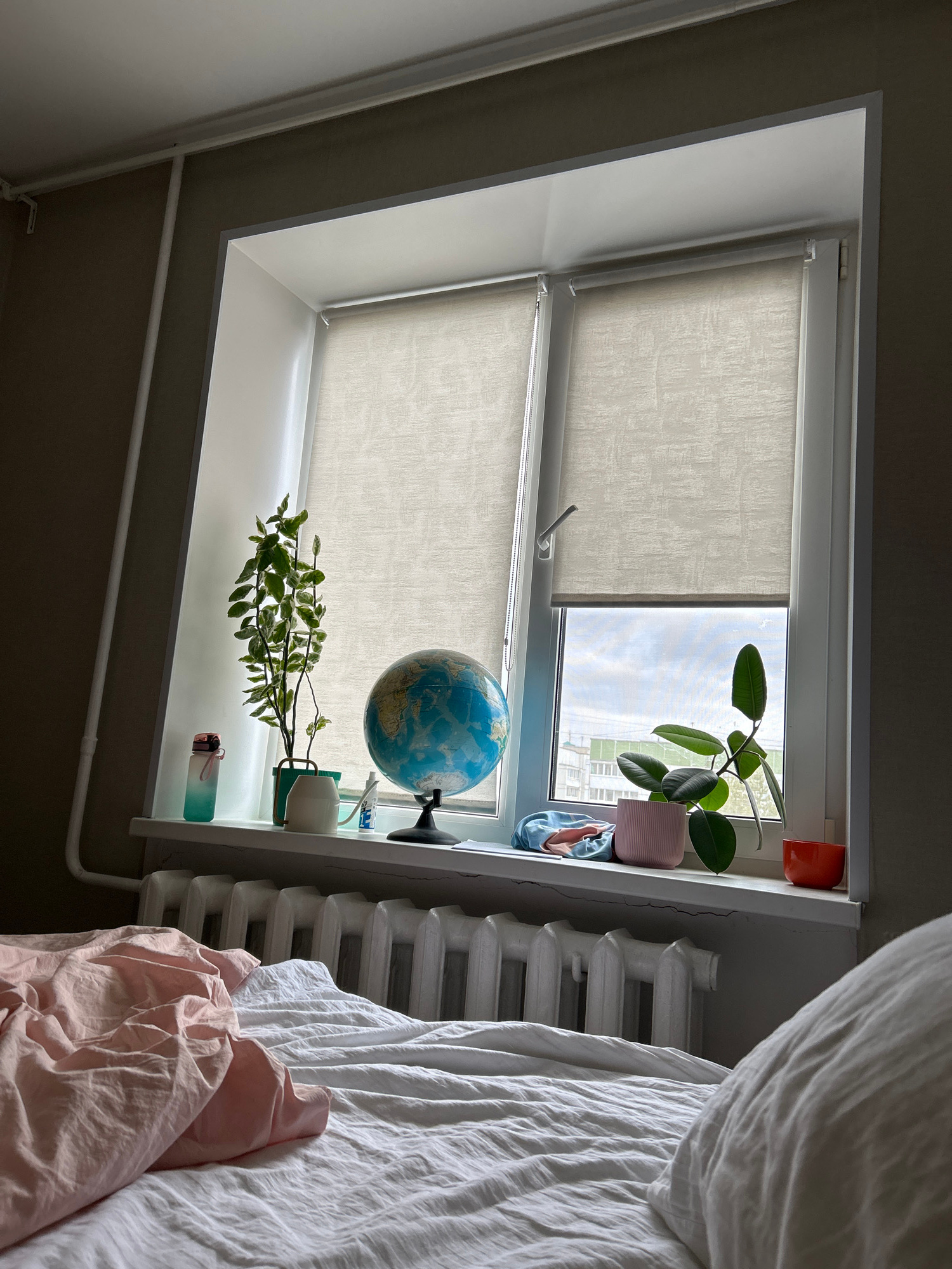 This is an interior, eye-level shot of a room, likely a bedroom, in Chaikovsky, Russia, focusing on a window area. The scene is static, depicting no activity. The central subject is a wide window wit…read more