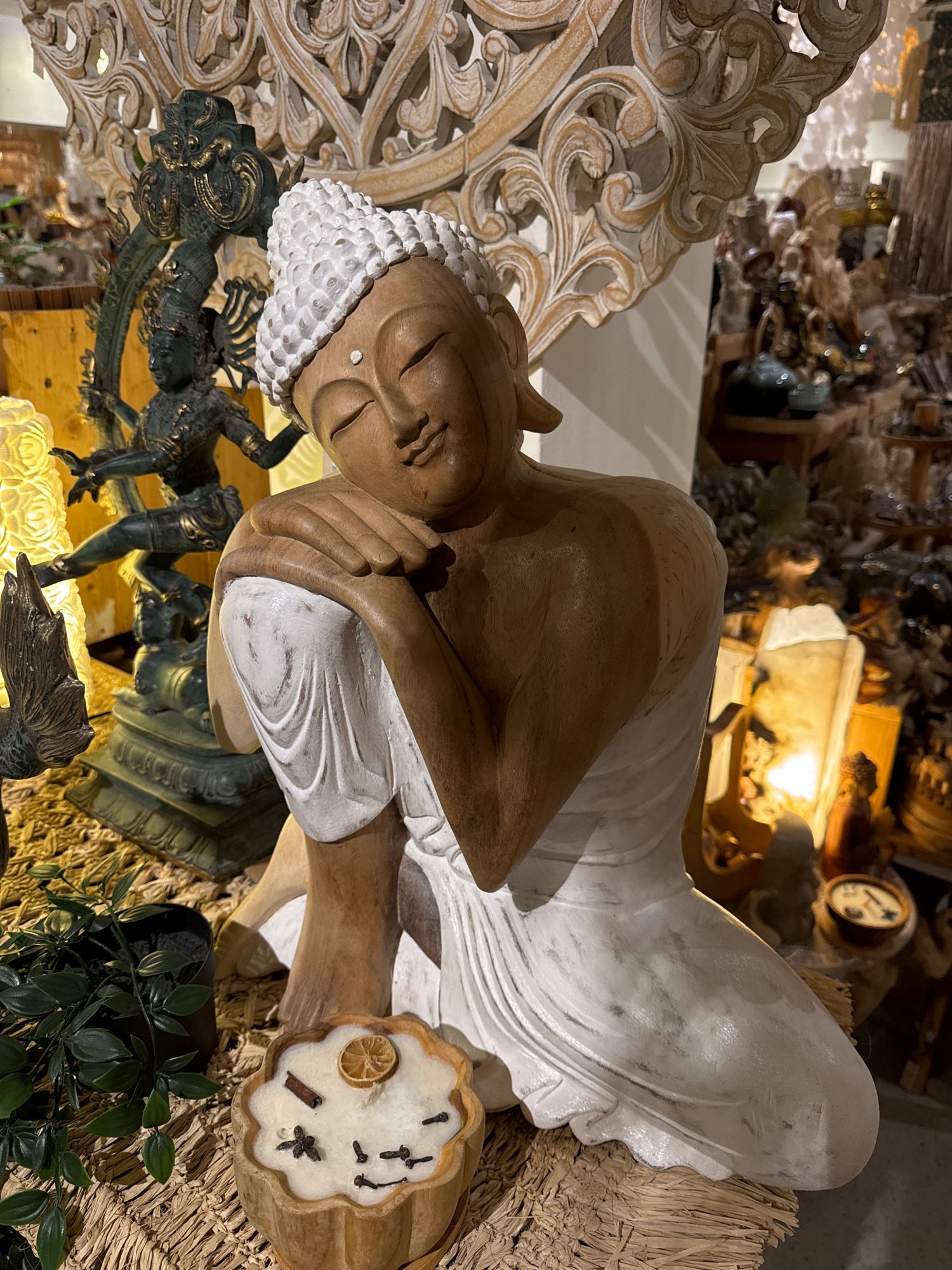 The image features a reclining Buddha statue. The statue is predominantly wood, with sections, such as the head covering and a portion of the robe, painted white. The Buddha is depicted lying on his s…read more