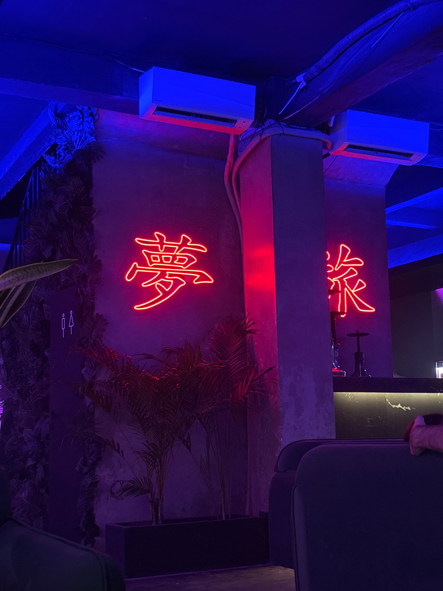 The image depicts the interior of a bar or lounge in an unspecified location in Unknown, Indonesia. The walls are painted grey and adorned with neon signs in the shape of Chinese characters. Tropical…read more
