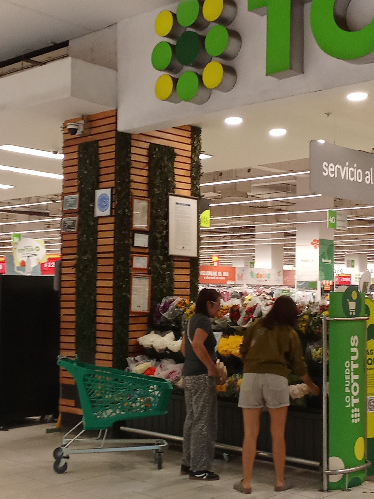 The image depicts a scene inside a Tottus supermarket. Two female customers are visible near a flower display. One woman wears gray patterned pants and a dark t-shirt, while the other wears an olive-g…read more