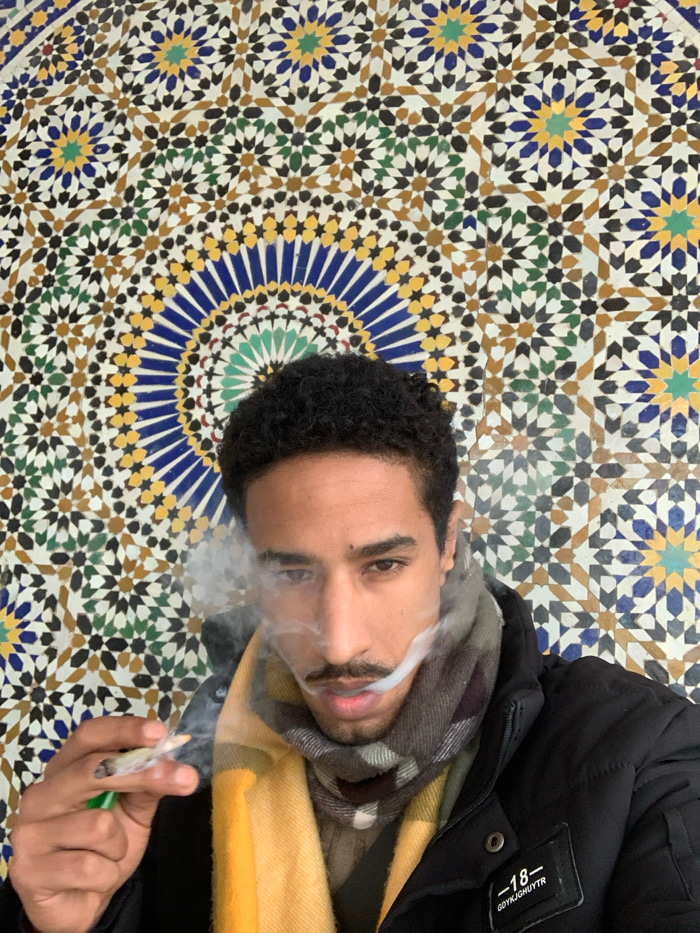 The image captures a close-up of a person, likely a young adult male, taken from a slightly upward and tilted perspective. The person's face is central, with smoke exhaling from his mouth, partially oβ¦read more