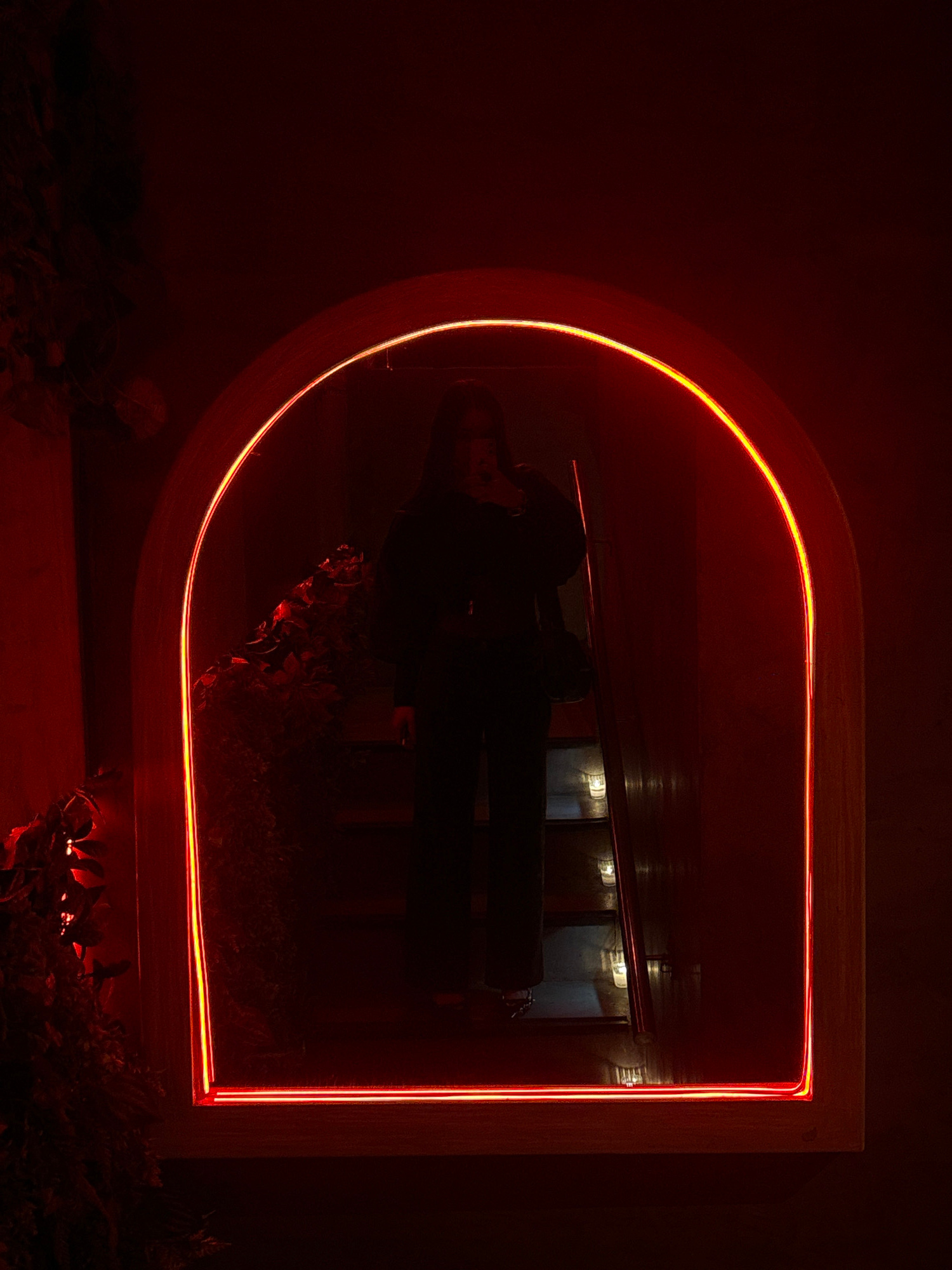 Captured indoors at night in Mexico City, Mexico, a brightly lit red neon light in the shape of a stylized "D" dominates the frame. It is set within a wooden frame and reflects the interior of a build…read more
