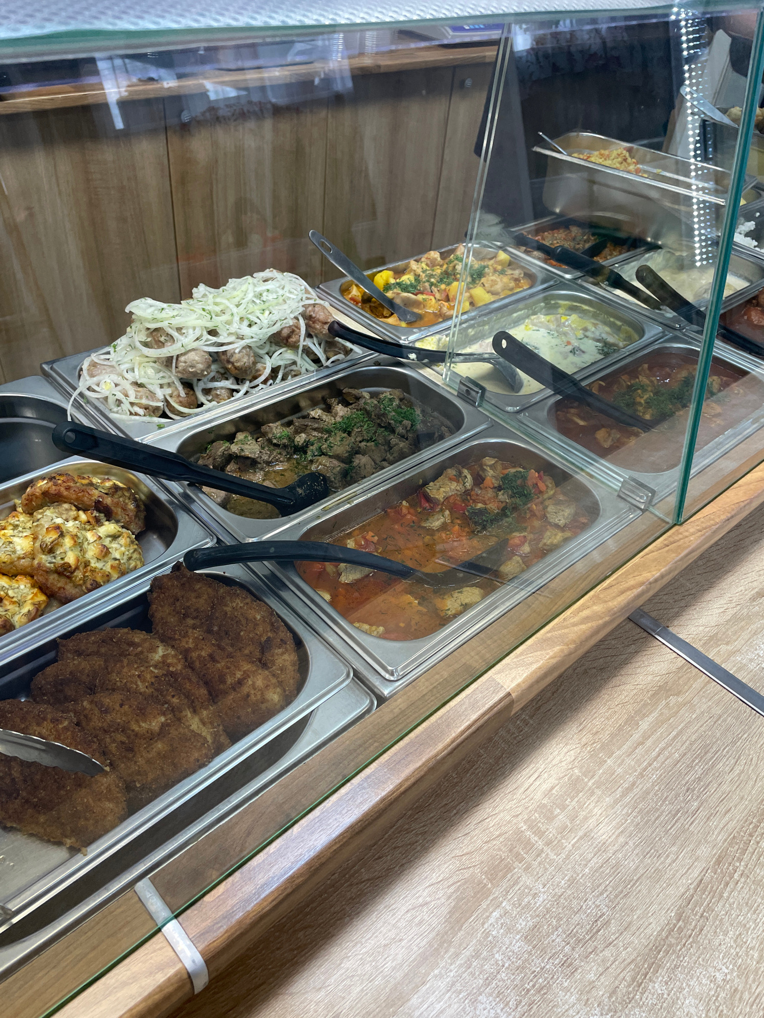The image displays a well-stocked food service counter, likely in a cafeteria, buffet, or casual restaurant setting in Krasnoyarsk, Russia. Various cooked dishes are presented in multiple stainless st…read more