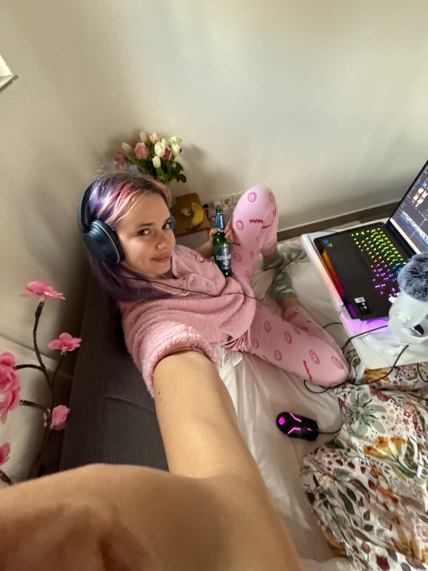 An overhead, slightly angled view shows a female individual in a bedroom setting, likely in the City of Zagreb, Croatia. The subject has multi-colored hair (purple and pink) and is wearing dark blue o…read more