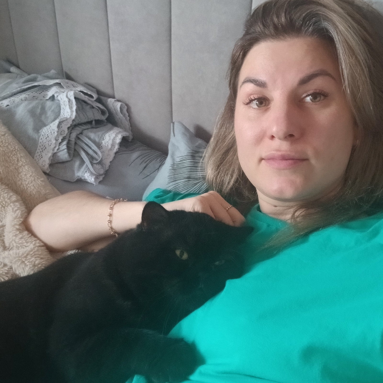 A woman lies in a bed with a black cat resting on her chest. The woman is light-skinned, with light brown hair and brown eyes. She is wearing a green t-shirt. Her left arm is visible, adorned with a gā¦read more