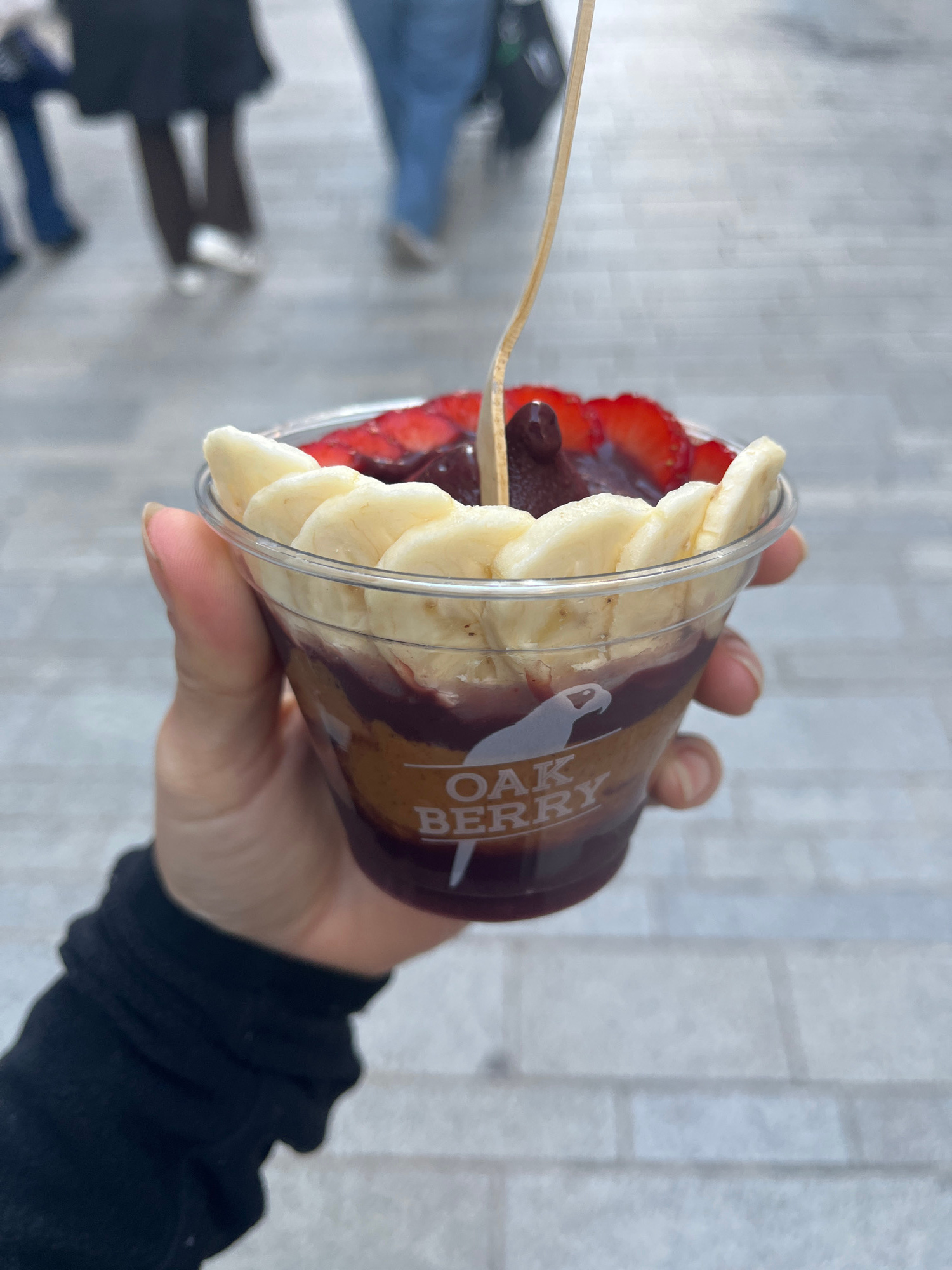 A hand holds a clear plastic cup filled with what appears to be an acai bowl. Inside the cup are slices of banana and strawberries. A wooden spoon is inserted into the acai bowl. The text "OAK BERRY"…read more