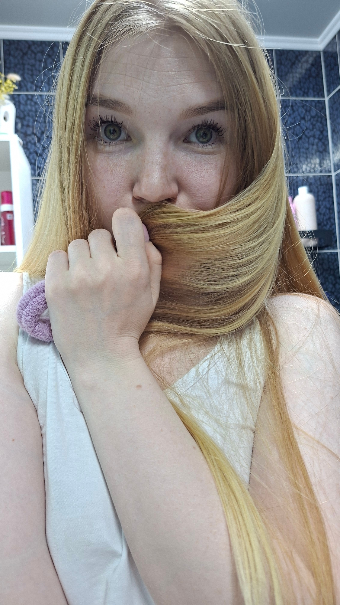 A close-up, tilted, selfie-style image shows a young, fair-skinned woman with light blonde hair and green eyes. She is holding a portion of her hair in front of her mouth. Her face shows freckles. She…read more