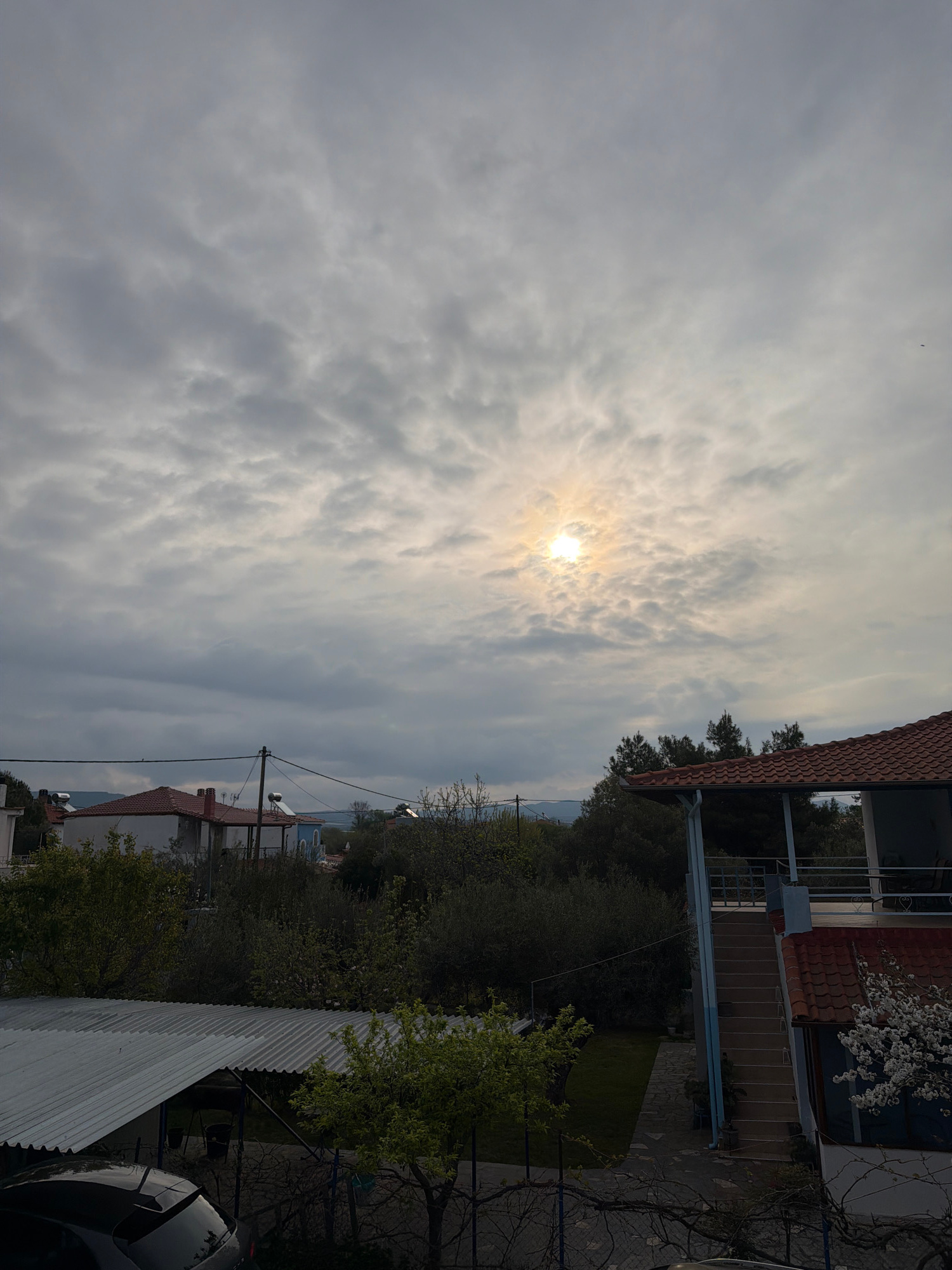 The photograph, taken outdoors in Παραλία Οφρυνίου, Greece, features a view dominated by a cloudy sky with the sun partially obscured. The environment includes houses and trees, with a close-up perspe…read more