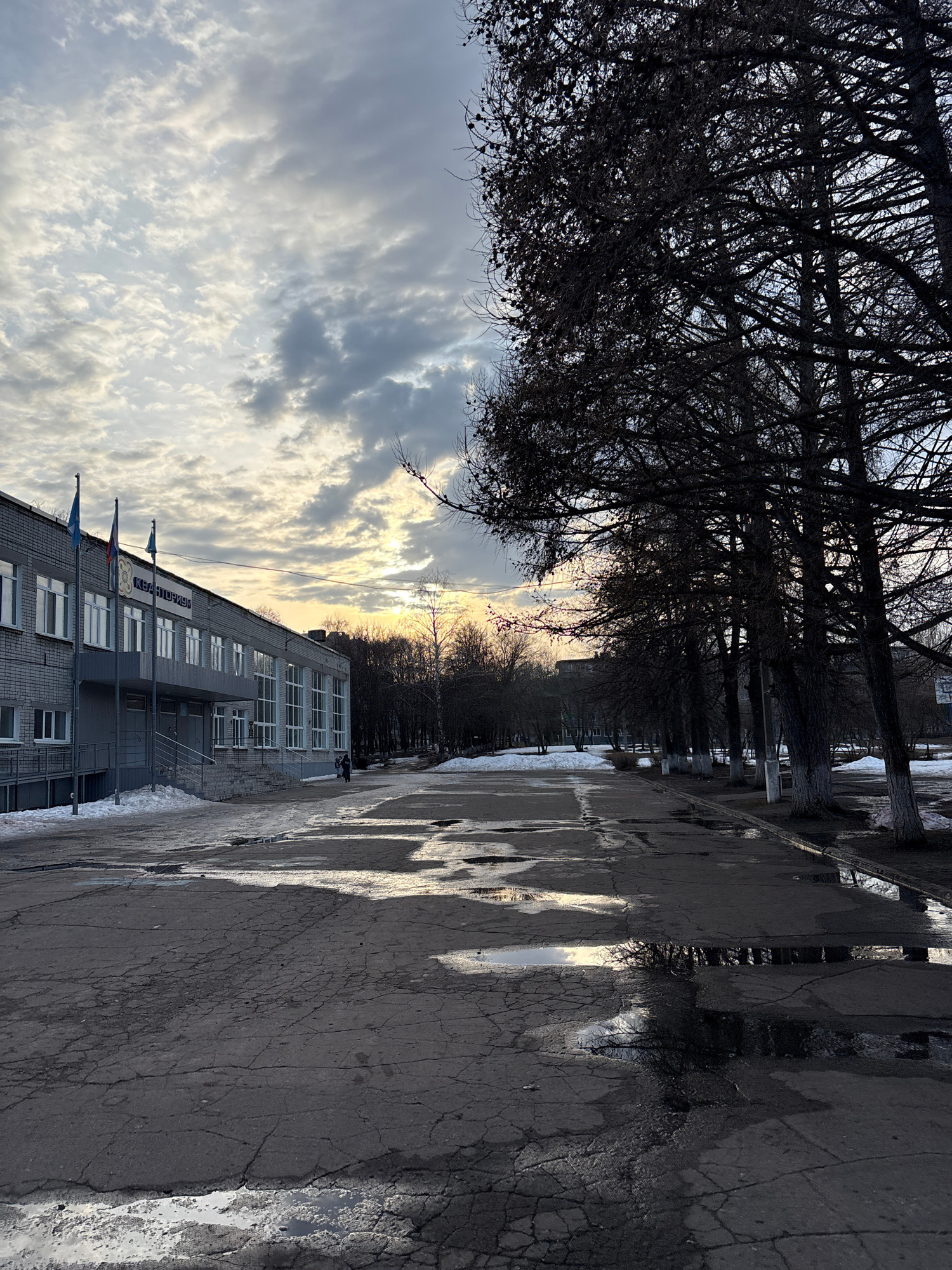 The image shows a view of a street in Ulyanovsk, Russia. A gray brick building stands adjacent to the cracked asphalt street, with three flagpoles in front. The building has multiple windows. A row of…read more