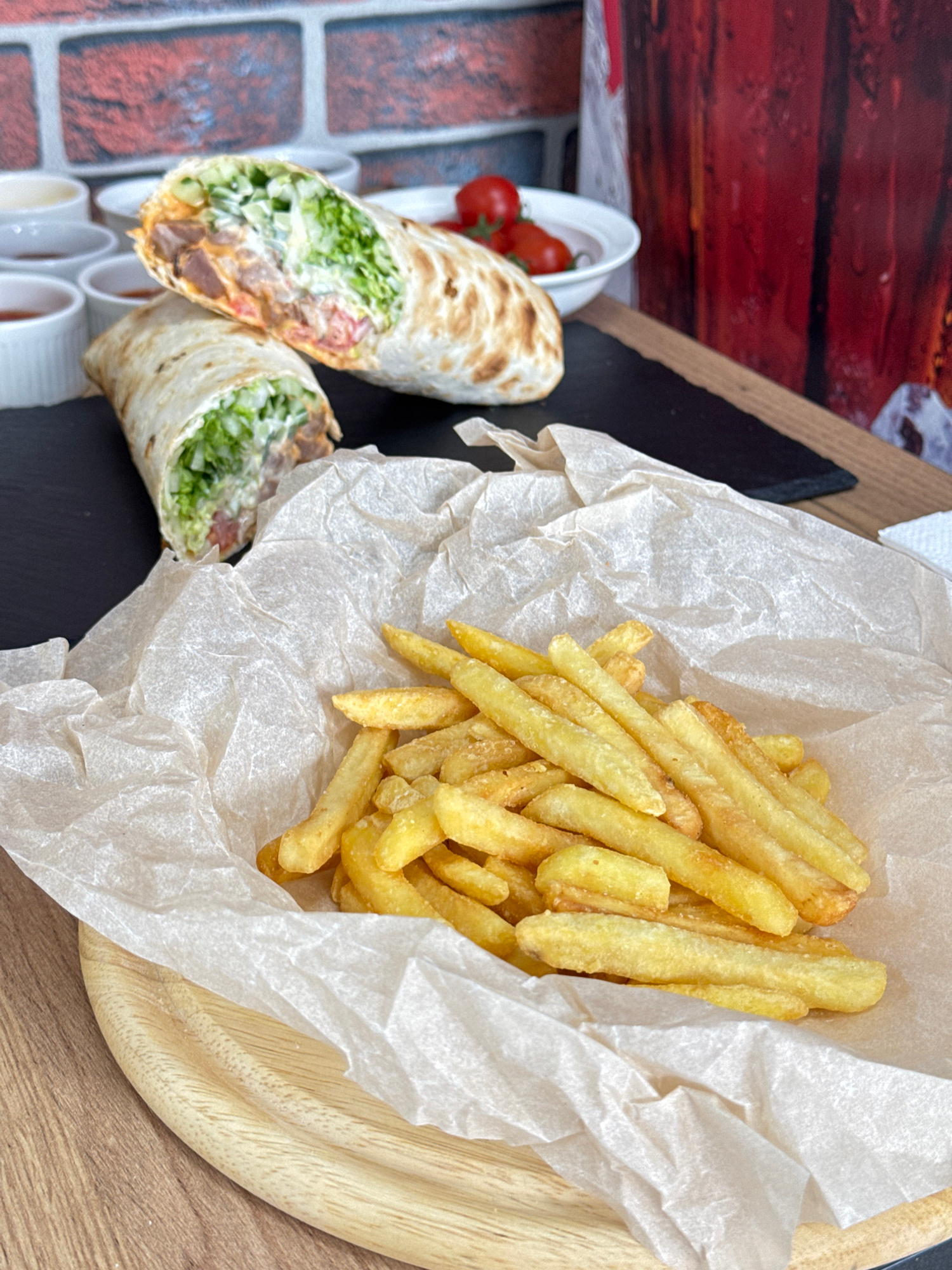 The image shows a wooden platter with two halves of a shawarma-like wrap and a portion of french fries in paper. The wraps appear to contain lettuce, tomato, and some kind of meat. Small white cups co…read more