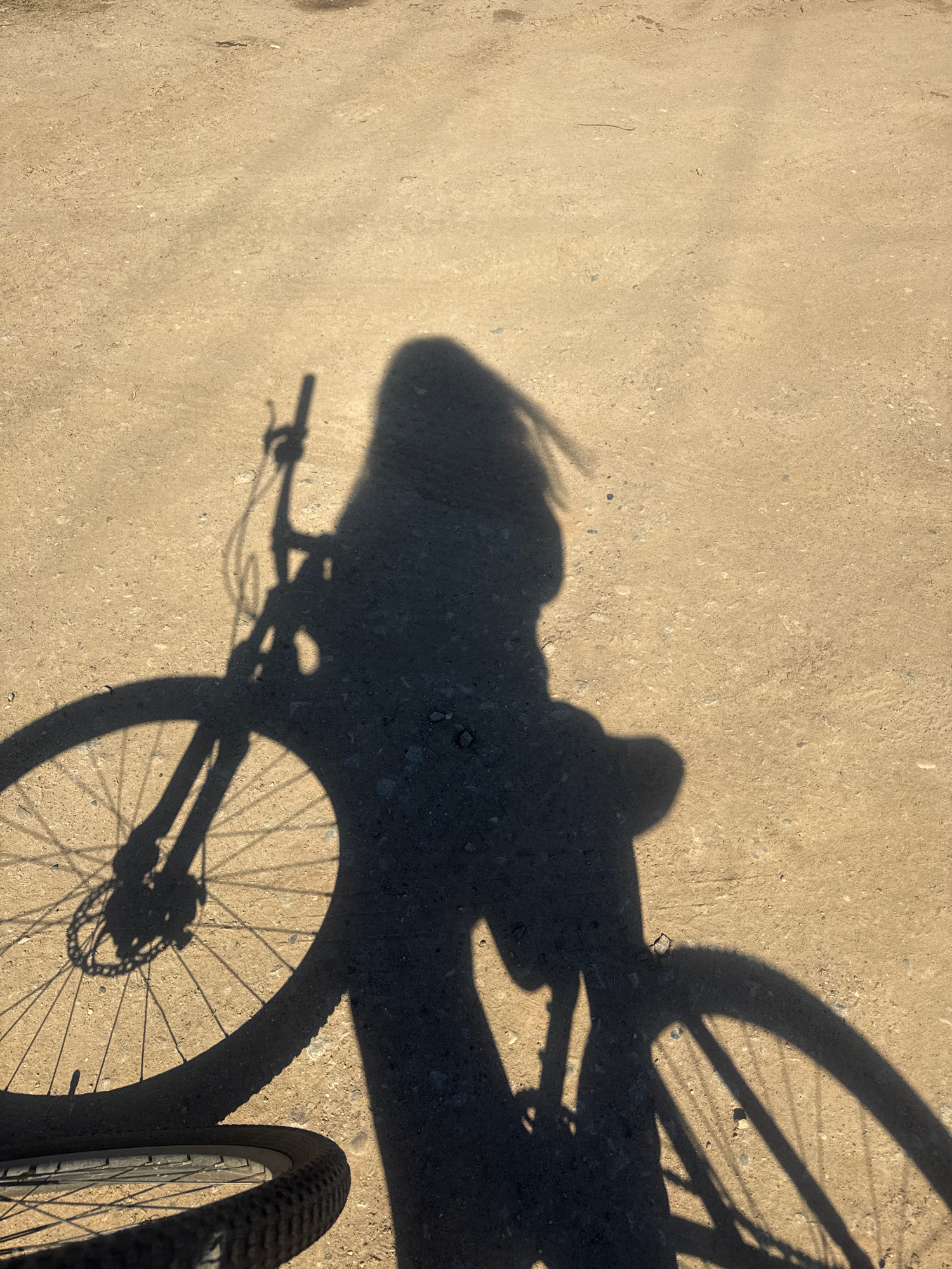 An overhead photograph captures the distinct shadow of a person riding a bicycle on a light-colored, unpaved surface, likely a dirt or gravel path. The strong, elongated shadows indicate a low sun ang…read more
