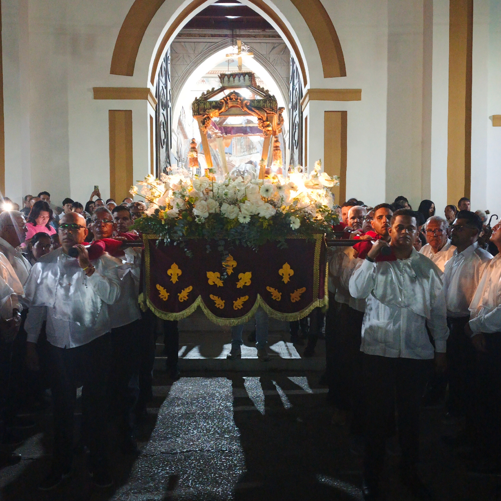 A procession in Tinaquillo, Venezuela, showcases men carrying a religious float adorned with white flowers and a burgundy cloth with gold fleur-de-lis designs. The float is elaborately decorated and i…read more