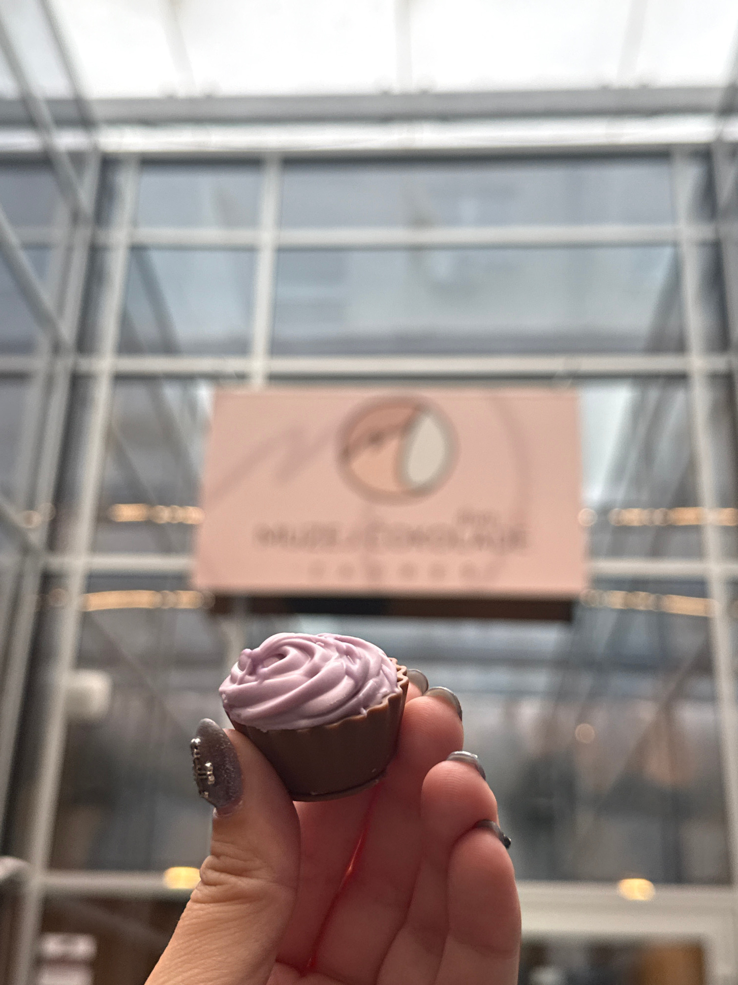 A hand holds a chocolate candy topped with a purple swirl in front of a windowed display case. The case contains a blurred pink sign bearing a logo. The location is identified as being in the city of…read more