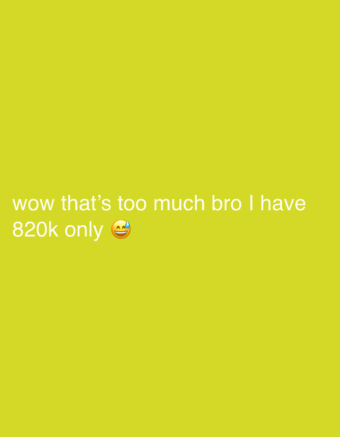 The image has a yellow background and contains the text "wow that's too much bro I have 820k only" along with a grinning face with sweat emoji. The location in Chongqing High-tech Zone, China is not v…read more