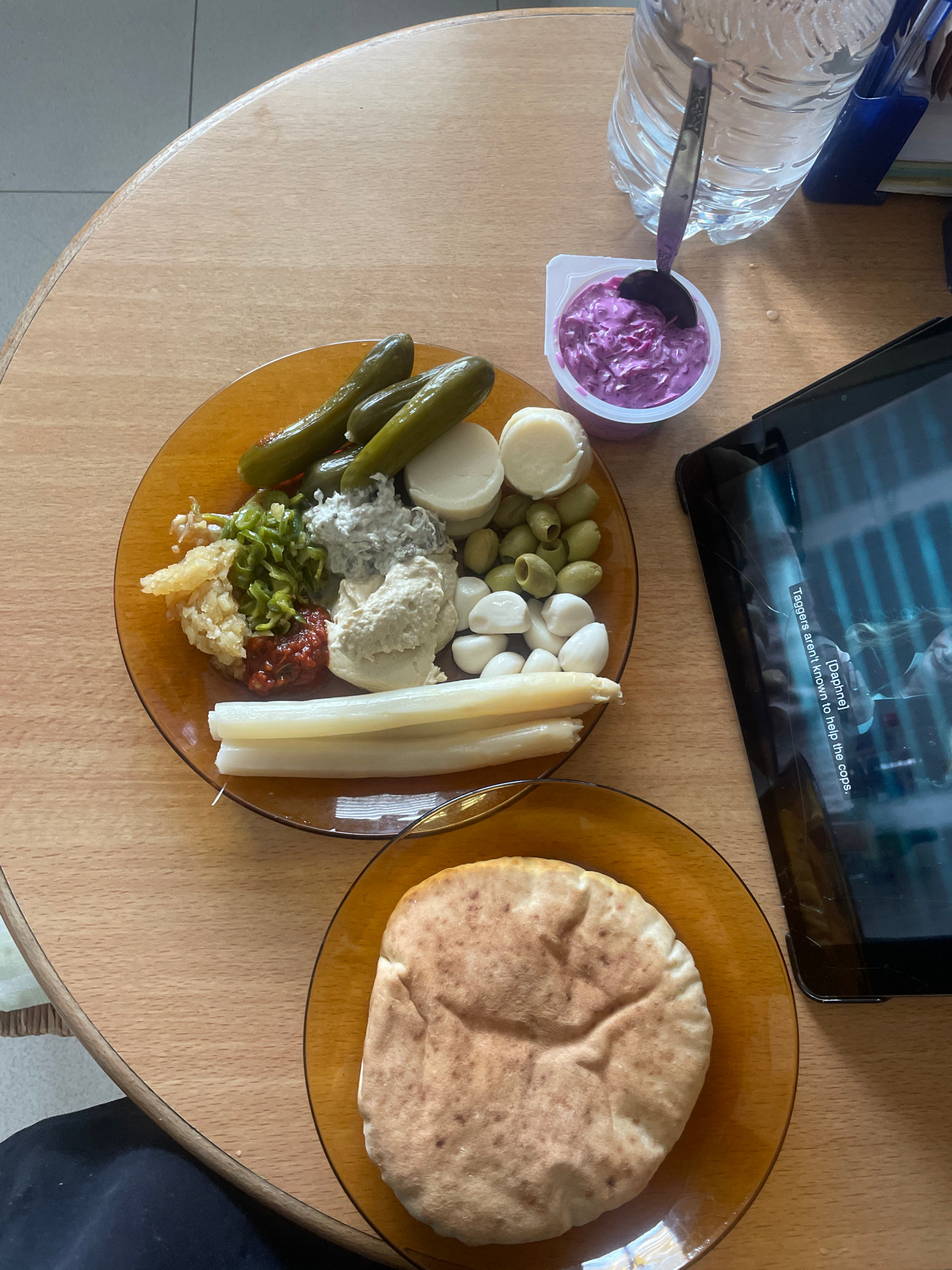 The image depicts an overhead view of a light wood-colored round table, presumably indoors, located in Petah Tikva, Israel. The table is set with food items, a digital tablet, and a water bottle. A l…read more
