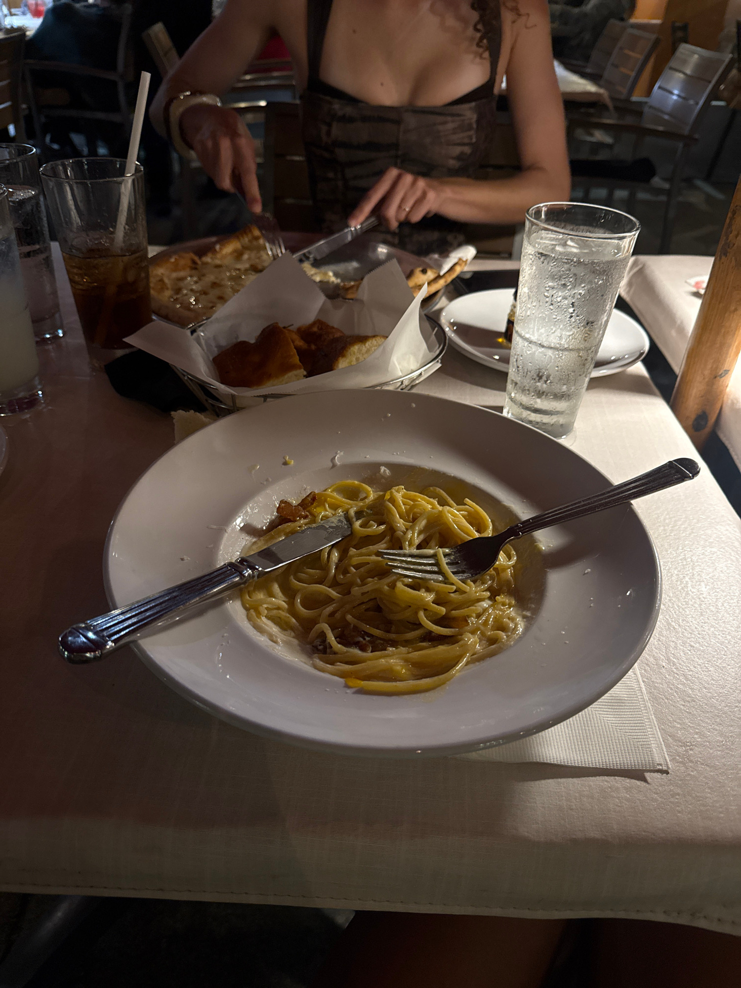 The scene shows a table setting with a plate of pasta, likely carbonara, with a fork and knife placed on top. Next to the plate is a basket of bread. There is a glass of water and another drink with a…read more
