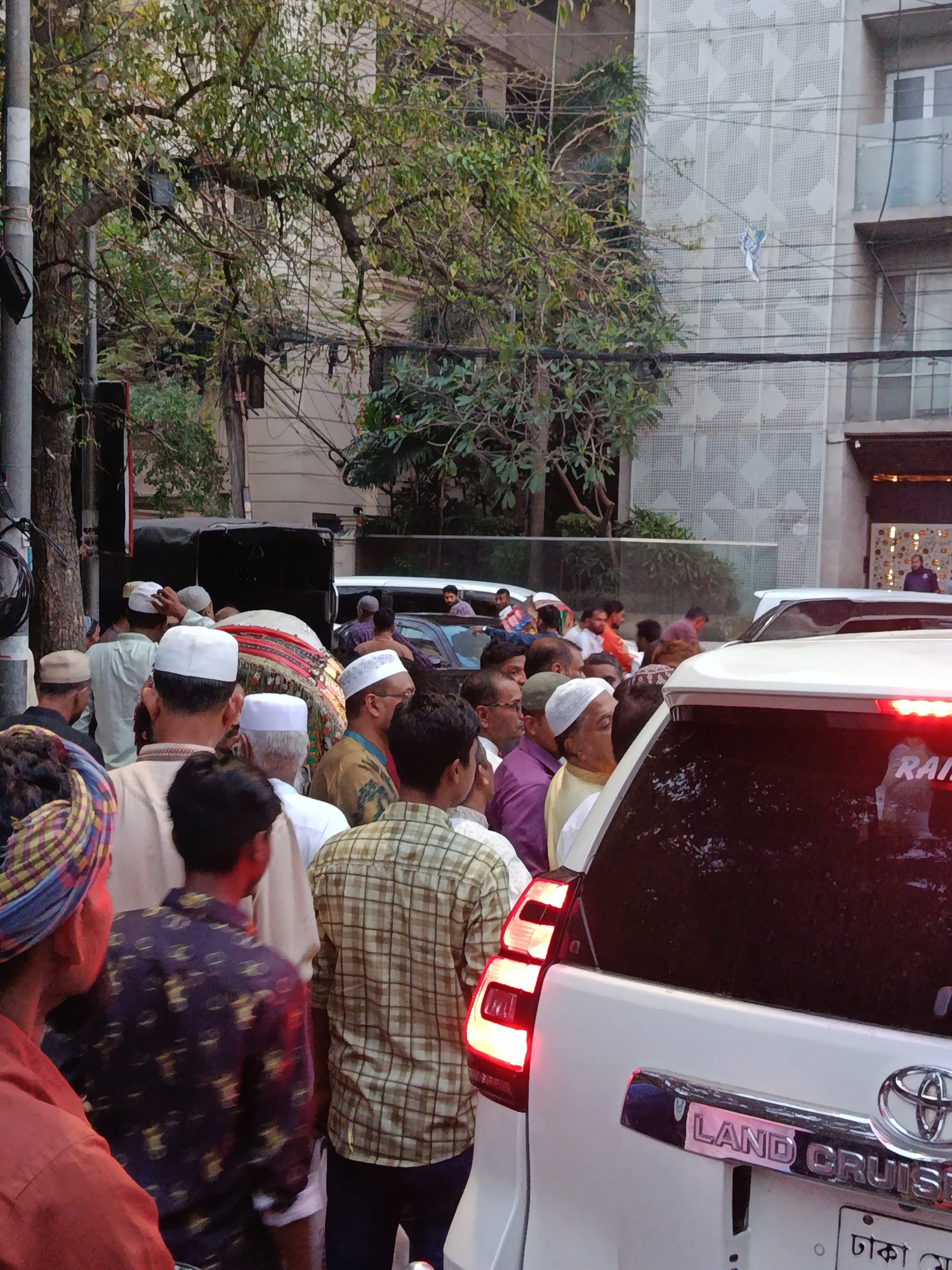 The image shows a crowded street scene in Dhaka, Bangladesh. A large group of men, many wearing Muslim skullcaps, are gathered around a vehicle with speakers, suggesting a public gathering or processi…read more