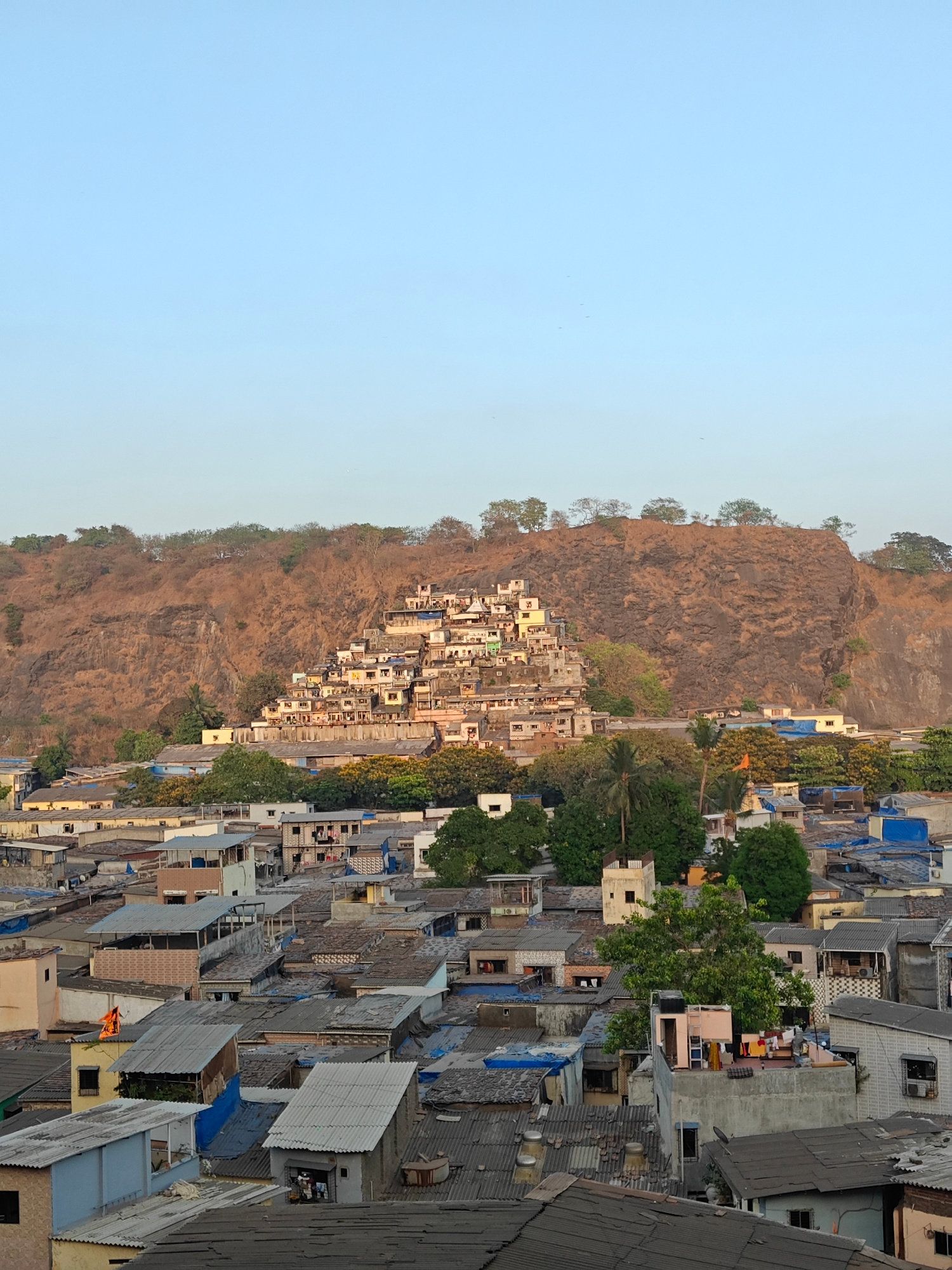 The image depicts a densely populated area in Mumbai, India, likely a slum or informal settlement. In the foreground, the scene is dominated by tightly packed houses with corrugated iron roofs in vari…read more