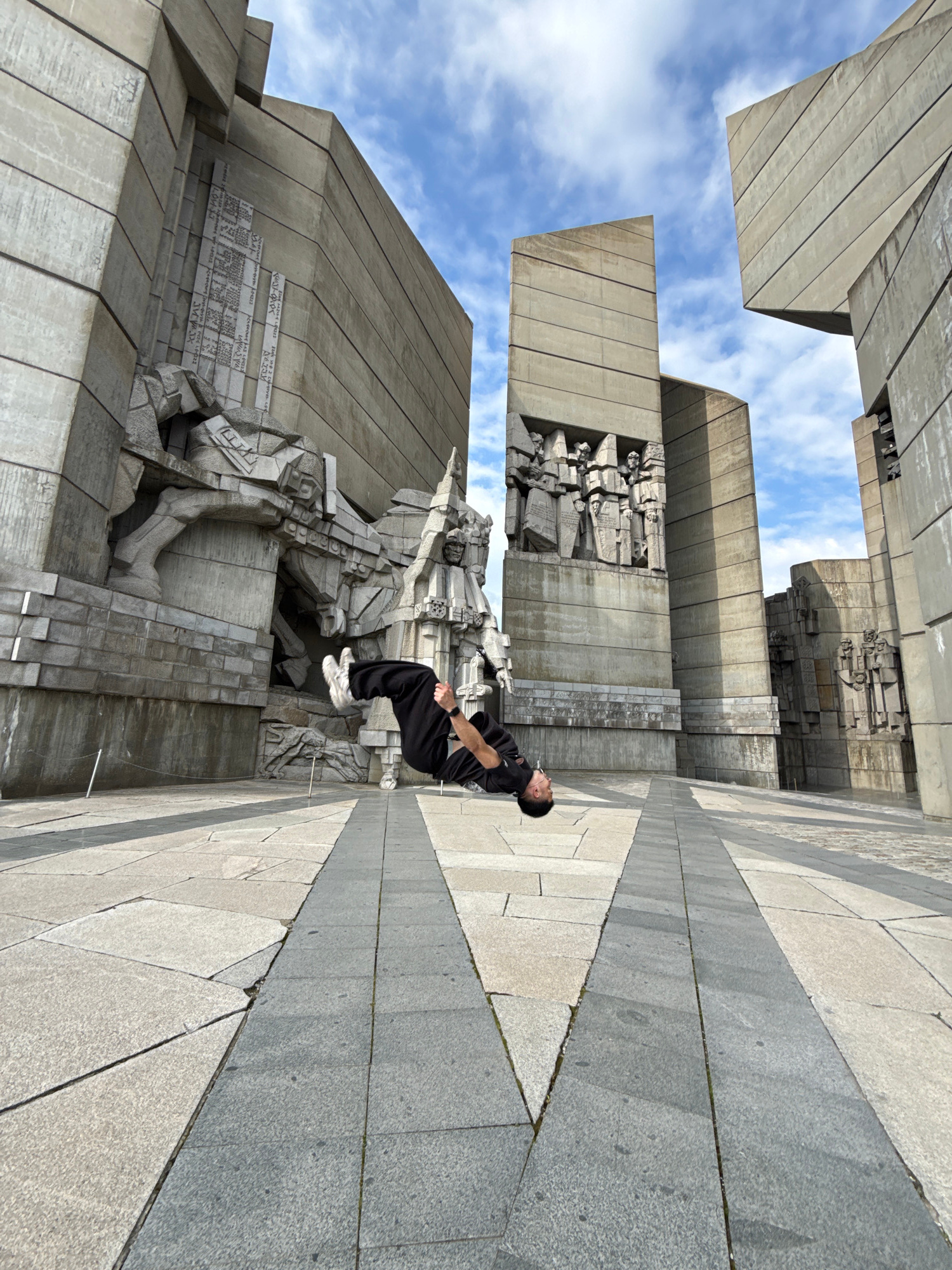 The image captures a man sitting on the architectural details of the Monument to 1300 Years of Bulgaria in Shumen, Bulgaria. The monument is a large, brutalist-style structure with abstract sculptures…read more