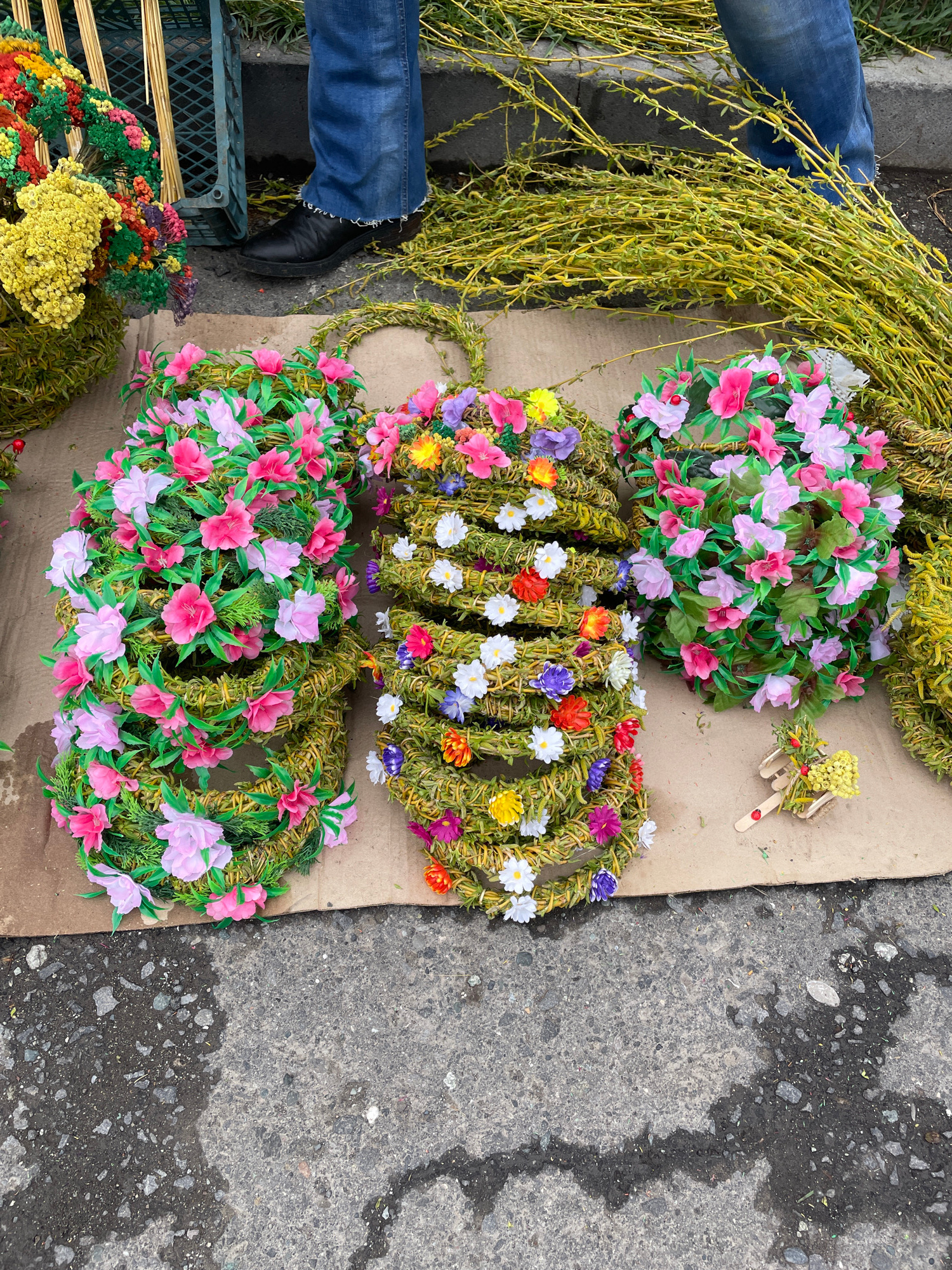 The image shows a selection of wreaths and floral arrangements displayed on a piece of cardboard on a Yerevan, Armenia street. There are four visible wreaths made of bound branches and adorned with arβ¦read more