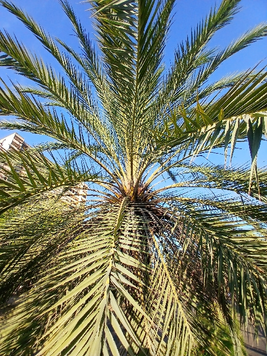 A low-angle shot features a palm tree against a bright blue sky. The fronds spread outwards from the central trunk, their feathery leaves filling most of the frame. The sun highlights the textured pat…read more