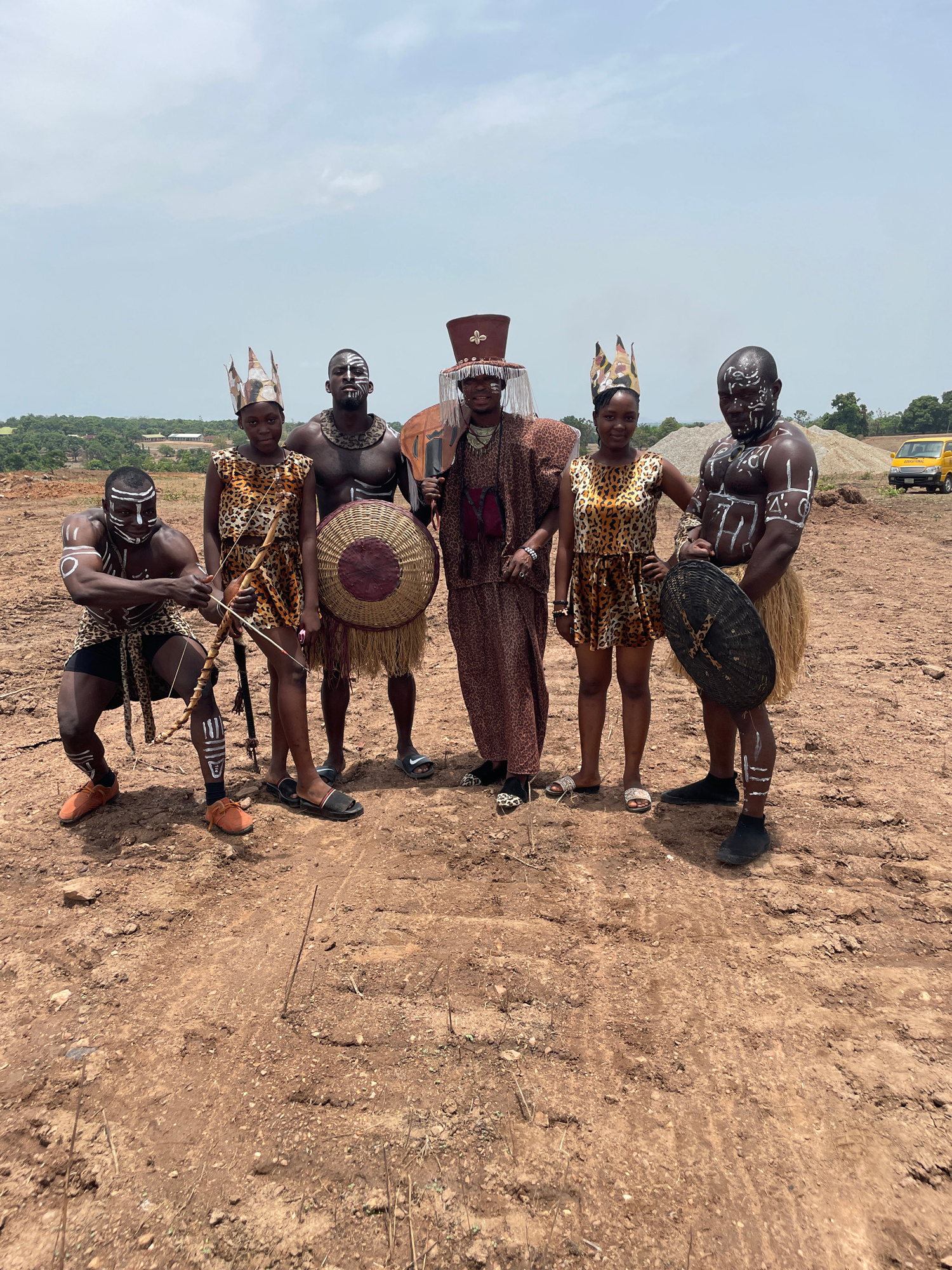 Six individuals are standing on dry, barren land. At the back, a yellow van is parked. All six are clad in traditional attire, including face paint, headdresses, leopard print clothing, and carrying s…read more