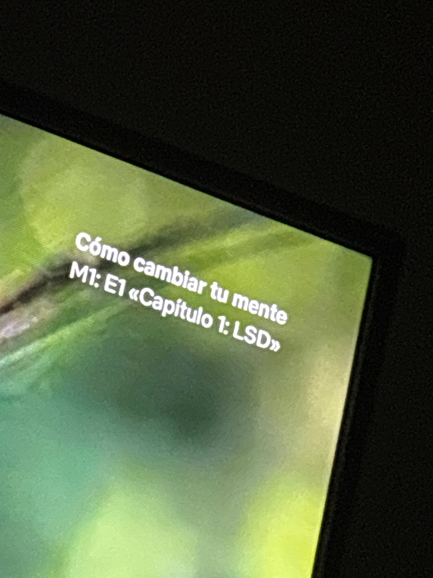 The image shows a close-up of a screen displaying text in Spanish: "Cómo cambiar tu mente M1: E1 «Capítulo 1: LSD»". The background of the screen appears to be a blurred image with green hues. The sur…read more
