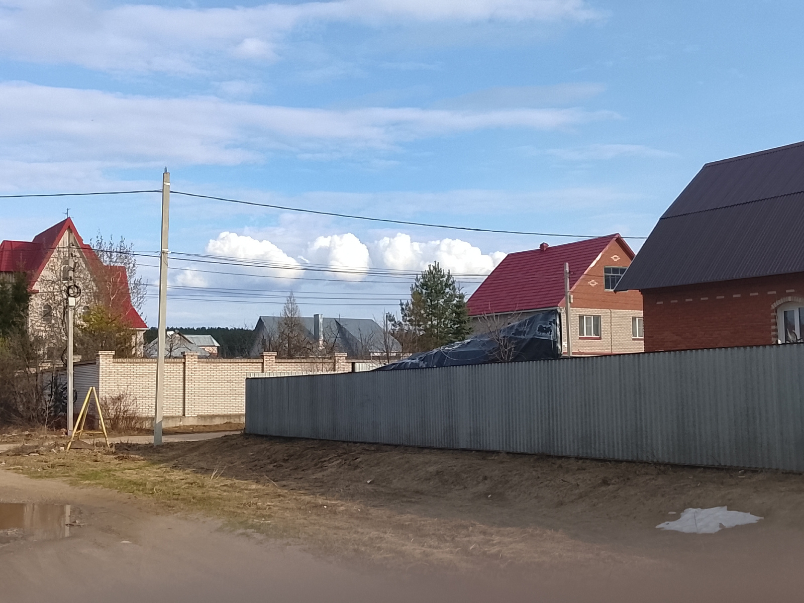 The image depicts a street scene in Chaikovsky, Russia. A gray corrugated metal fence runs horizontally across the middle ground, separating the street from a row of houses. The houses are varied in s…read more