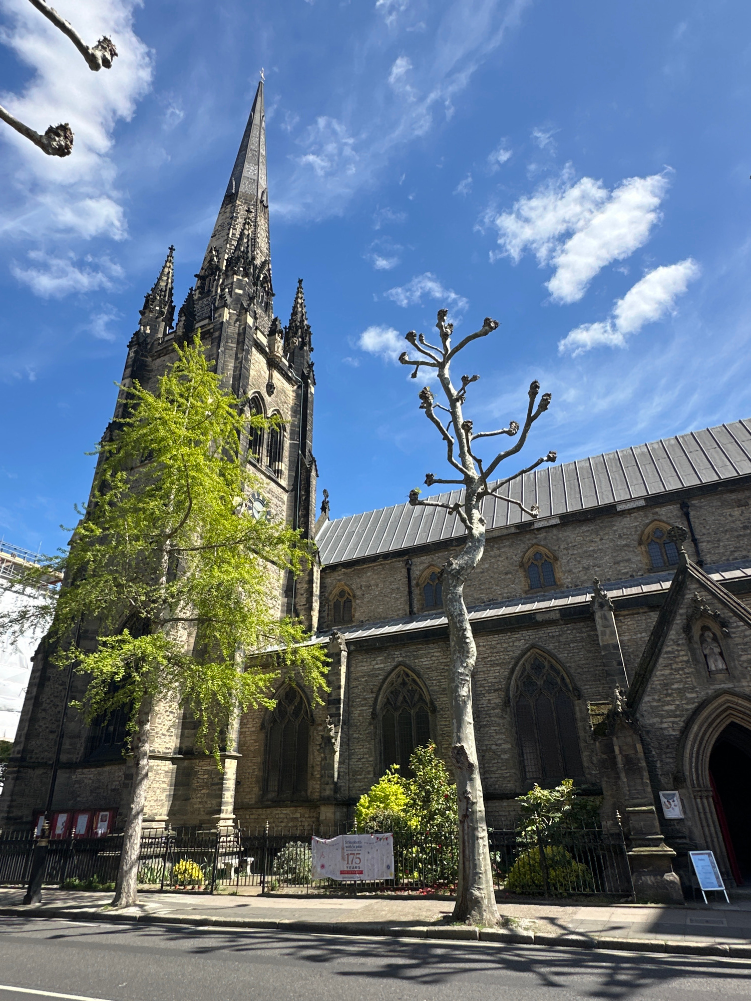 The image shows St. Dunstan-in-the-West Church in London, UK, viewed from a low angle. The church is made of gray stone and has a tall spire, visible against a blue sky with scattered clouds. A tree w…read more
