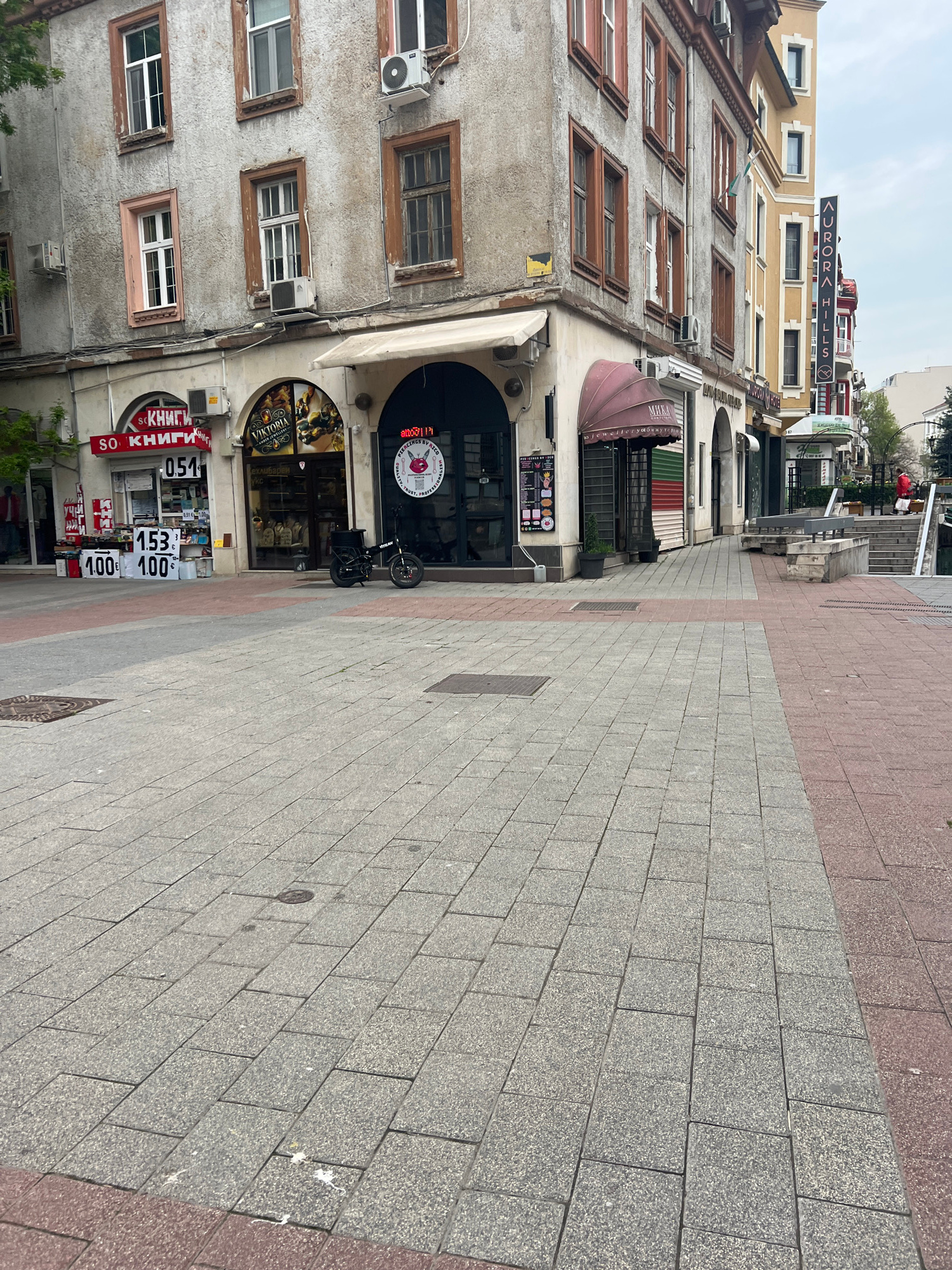 The image presents a daytime street scene in Plovdiv, Bulgaria, under an overcast sky. The perspective looks down a pedestrian walkway lined with multi-story buildings on the left. These structures fe…read more