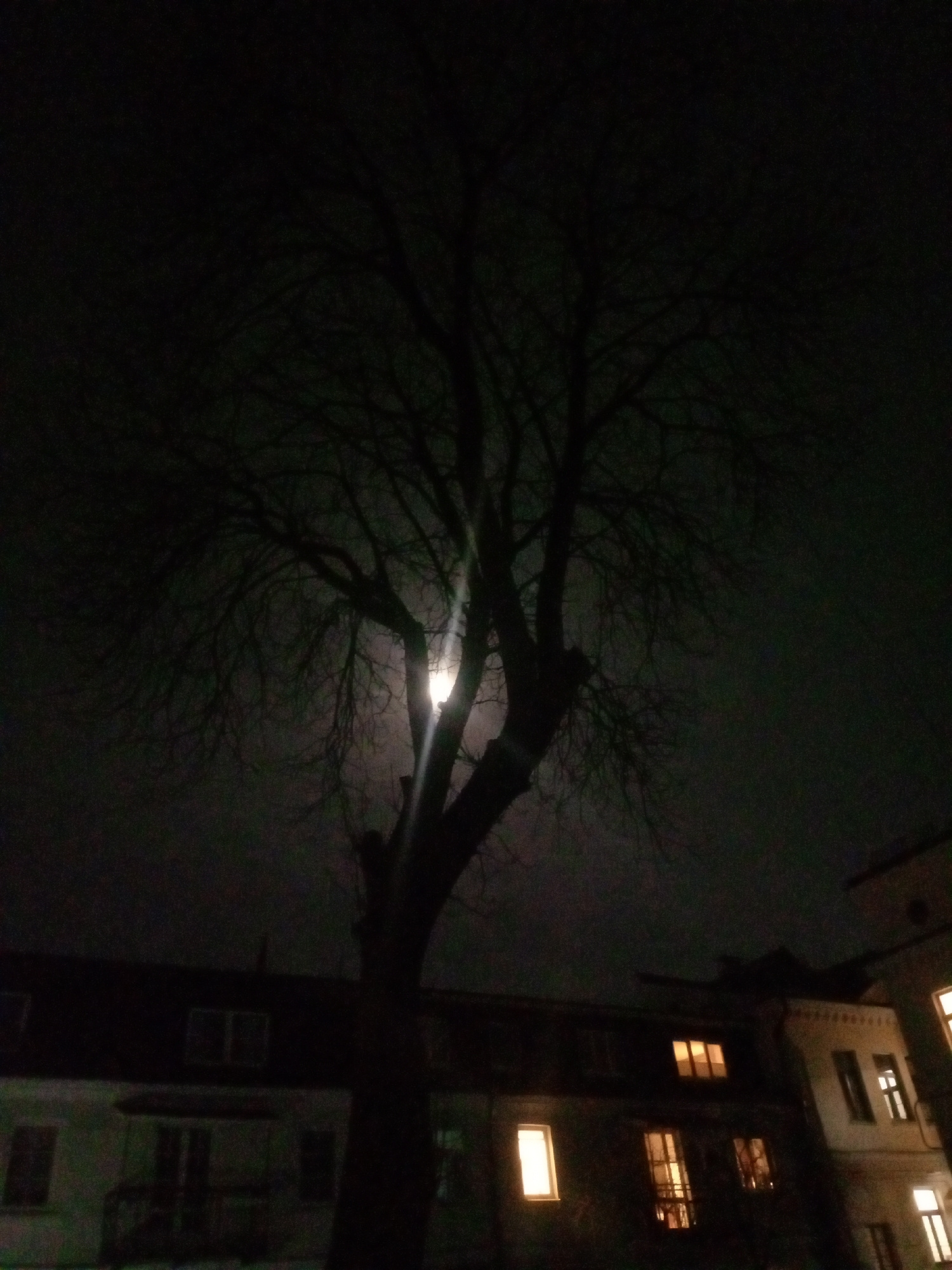 A nighttime image captures a tree with bare branches silhouetted against the dark sky, with a bright light source behind the tree. Below the tree are several buildings, some of which have illuminated…read more