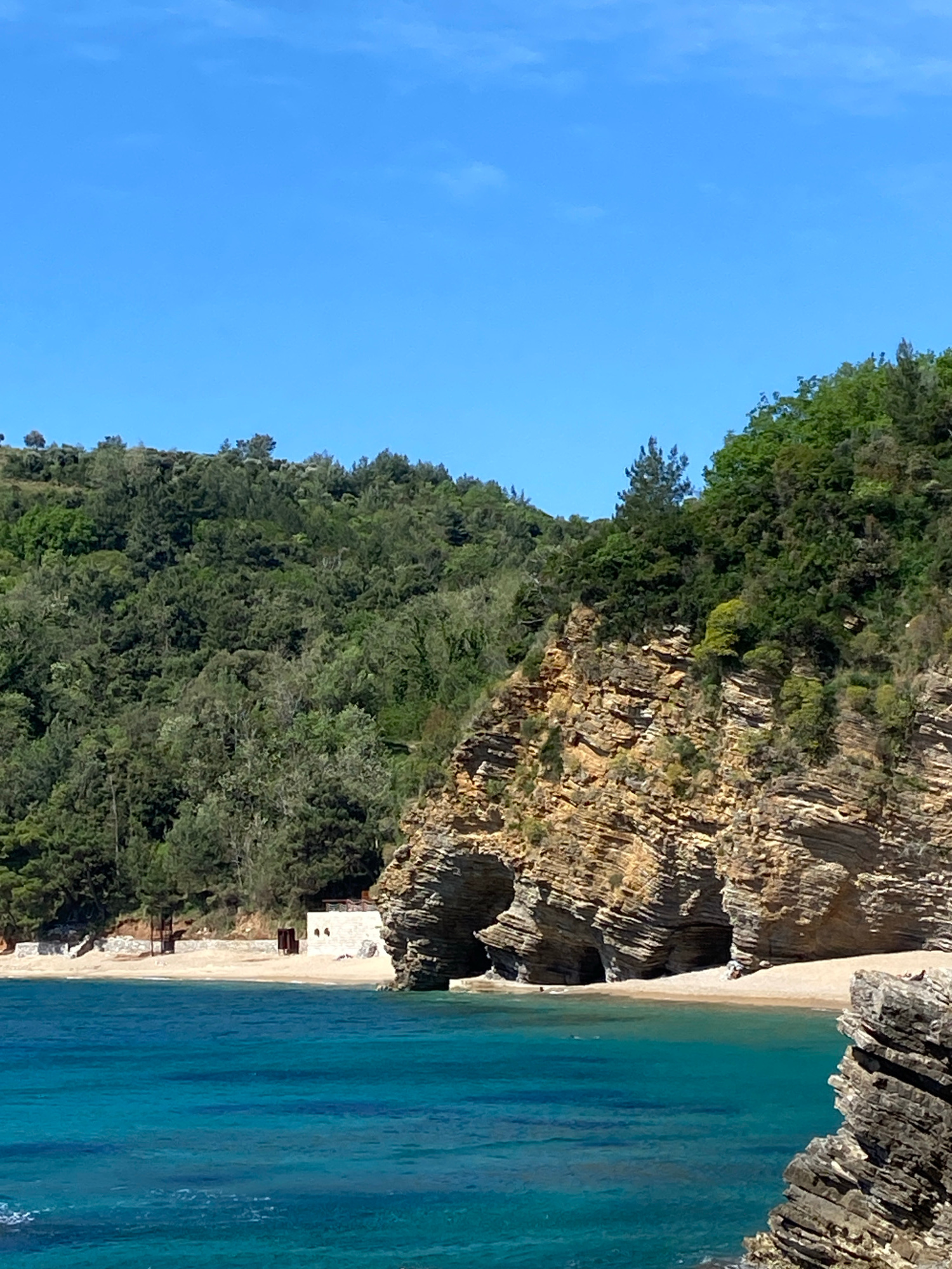 The image displays a serene coastal scene, likely a secluded bay or cove, under a clear blue sky. The photo is oriented vertically, showing the horizon line running from left to right. On the left si…read more
