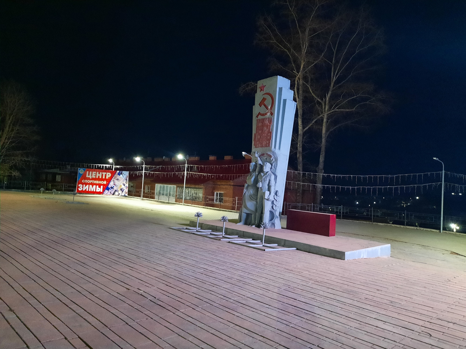 The image shows a monument in Krasnogorskoye, Russia, at night. The monument features a stylized depiction of soldiers and the communist hammer and sickle symbol. The ground is paved with rectangular…read more
