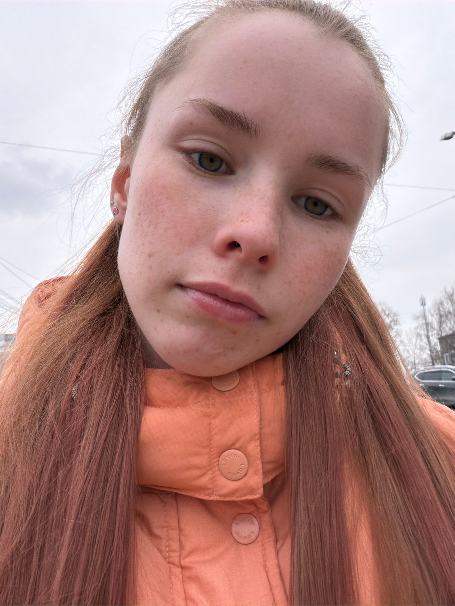 A young person with freckles and light hair is taking a selfie. They are wearing an orange jacket with buttons labeled "LOVE". The background is a cloudy sky, a street, and some buildings. While it is…read more