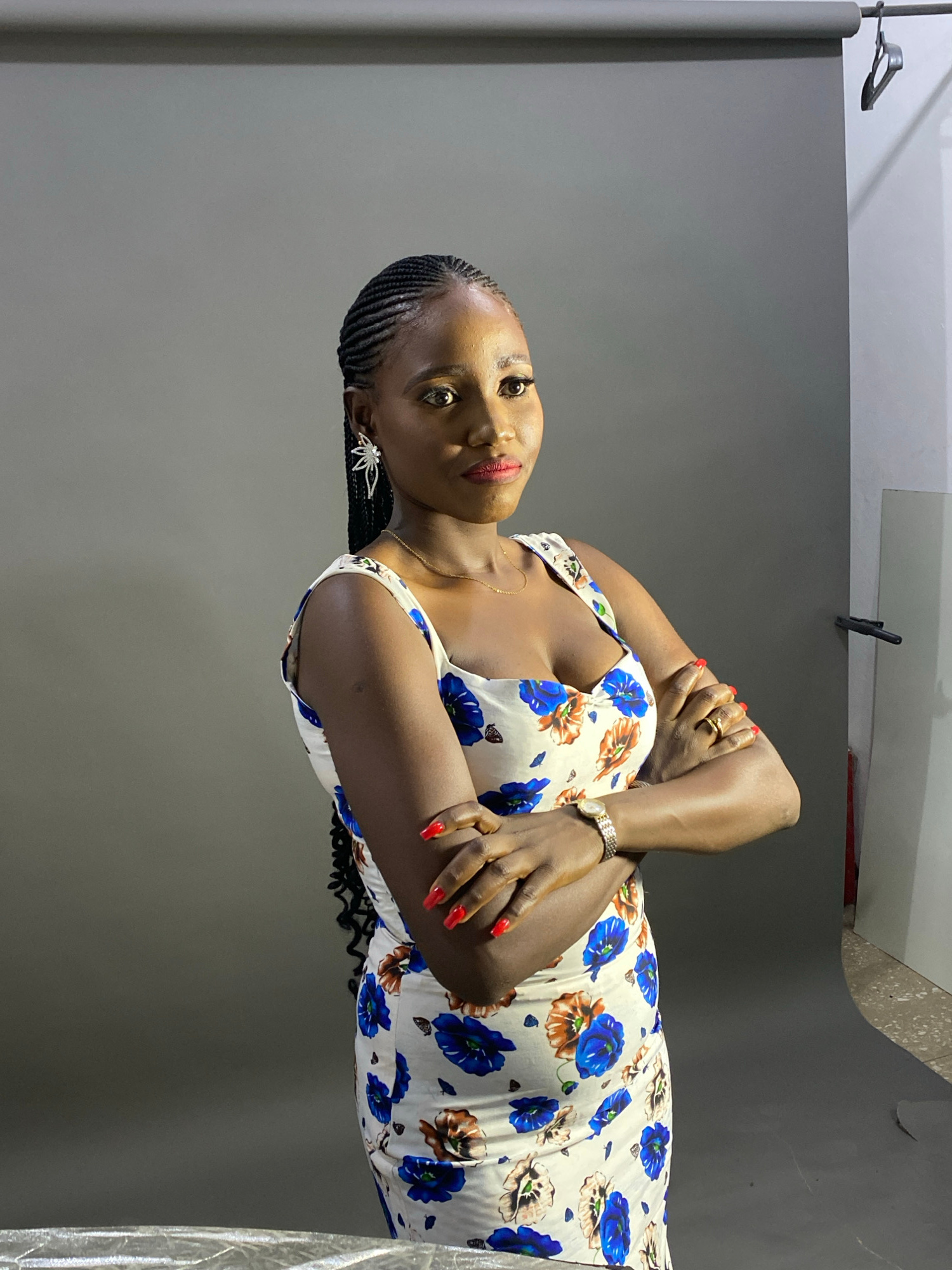 A woman is featured in a full-body portrait, standing against a plain grey studio backdrop, suggestive of an indoor photography session. She looks directly at the camera with a composed expression, he…read more