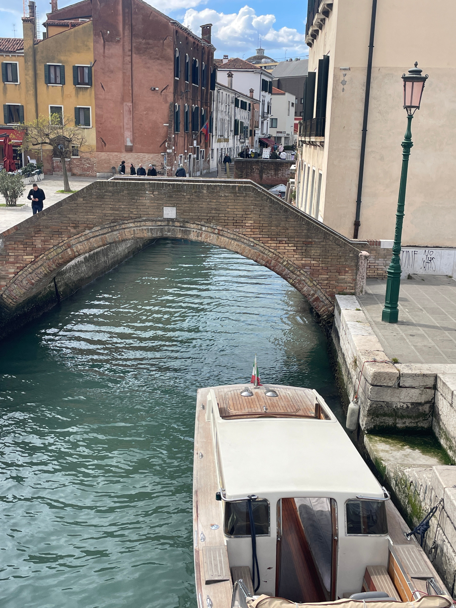 The image depicts a canal in Venice, Italy. A brick bridge arches over the canal, which reflects light and features ripples on its surface. A wooden boat with a white canopy is docked alongside a ston…read more