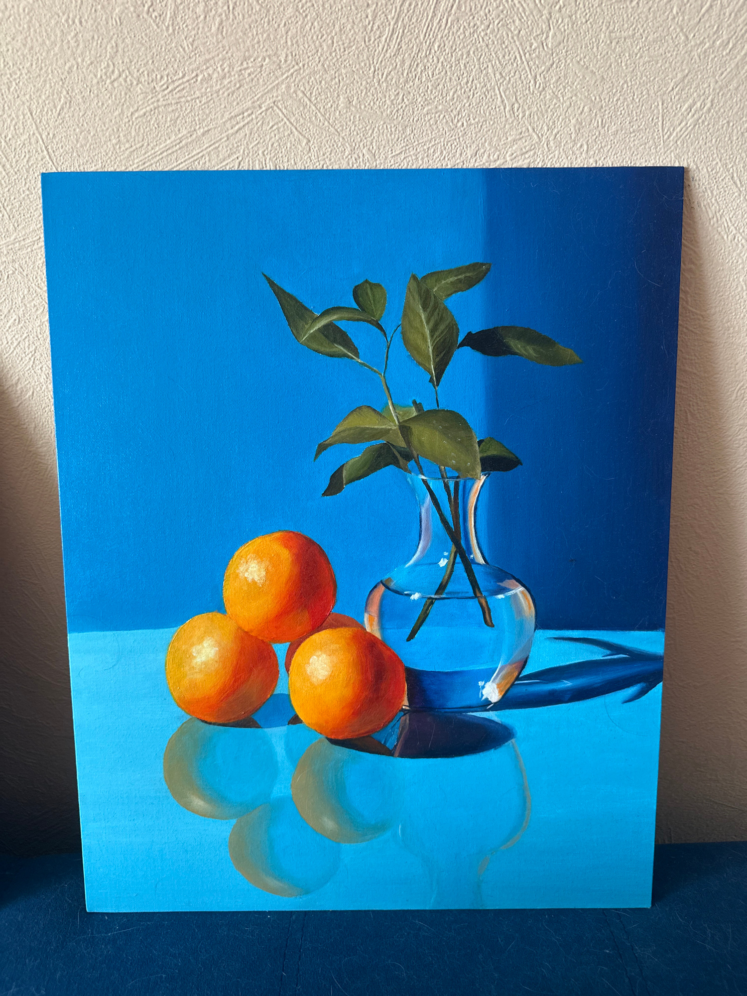 The image shows a still life painting. Three oranges are depicted in the lower right of the canvas. Above the oranges is a clear vase lying on its side with a few green branches inside. The background…read more