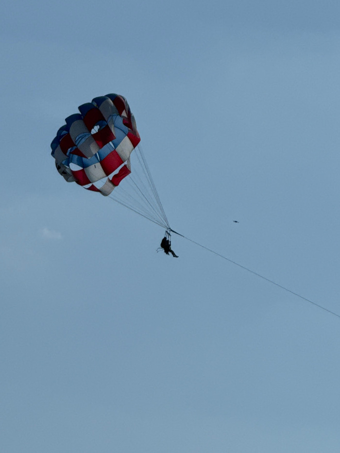 A single individual is parasailing against a clear, light blue sky above Cenang Beach, Malaysia. The inflated parasail canopy, located in the upper left, features a checkerboard pattern composed of re…read more