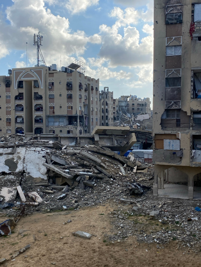 This image depicts a scene of widespread urban destruction in Khan Yunis, Palestinian Territory, under a partially cloudy sky. In the foreground, the ground consists of a sandy-brown expanse heavily l…read more