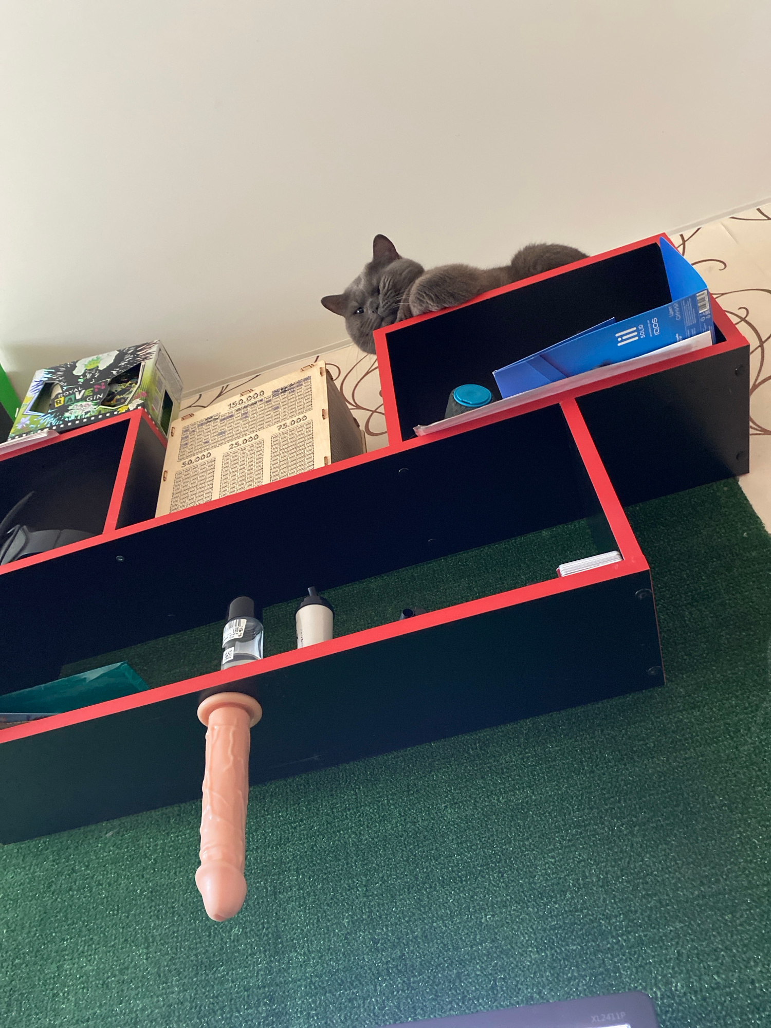 A gray cat peers from the top shelf of a black and red bookcase. The bookcase contains various objects including a blue box, a white box, a green bottle, and a flesh-colored sex toy. The background in…read more