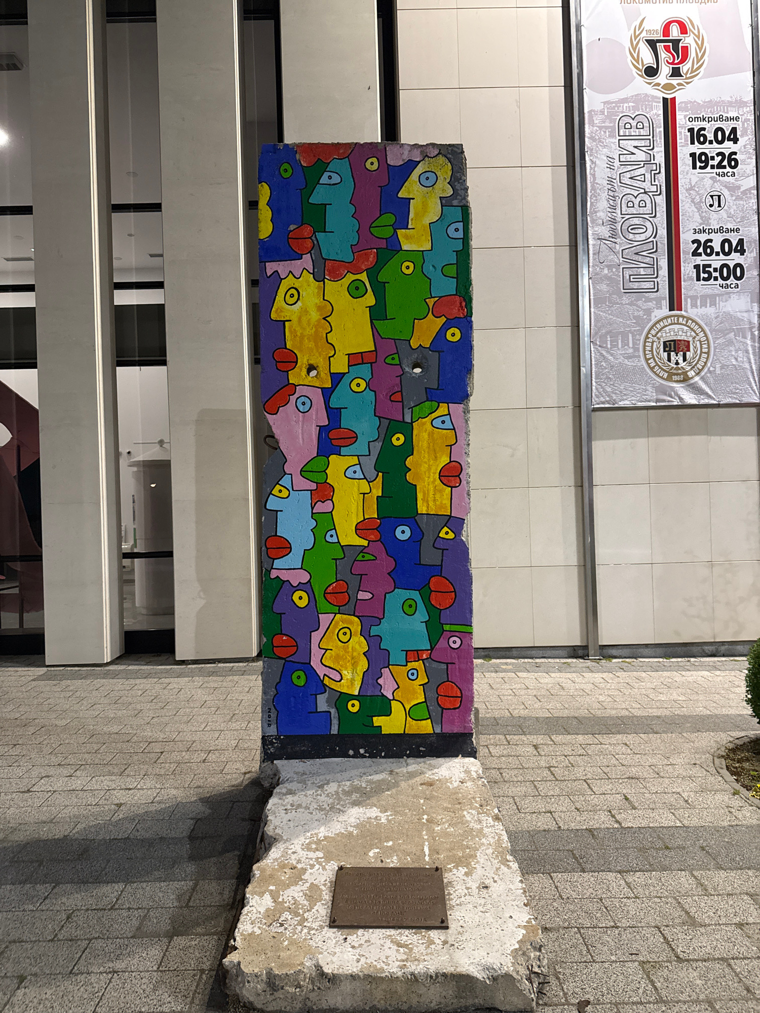 The image captures an outdoor urban scene in Plovdiv, Bulgaria, at what appears to be evening or night due to the artificial lighting. The central subject is a rectangular concrete block or barrier, h…read more