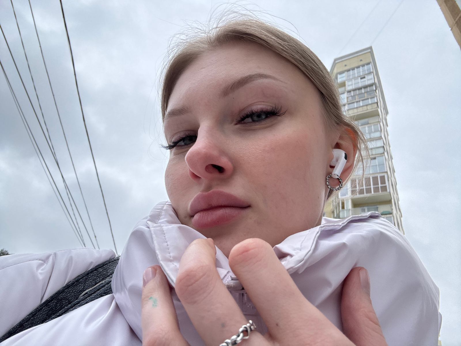 The image is an upside-down selfie of a young woman with light skin and blonde hair. She has an earbud in her left ear and a ring on one of her fingers. She is wearing a light-colored jacket. In the b…read more