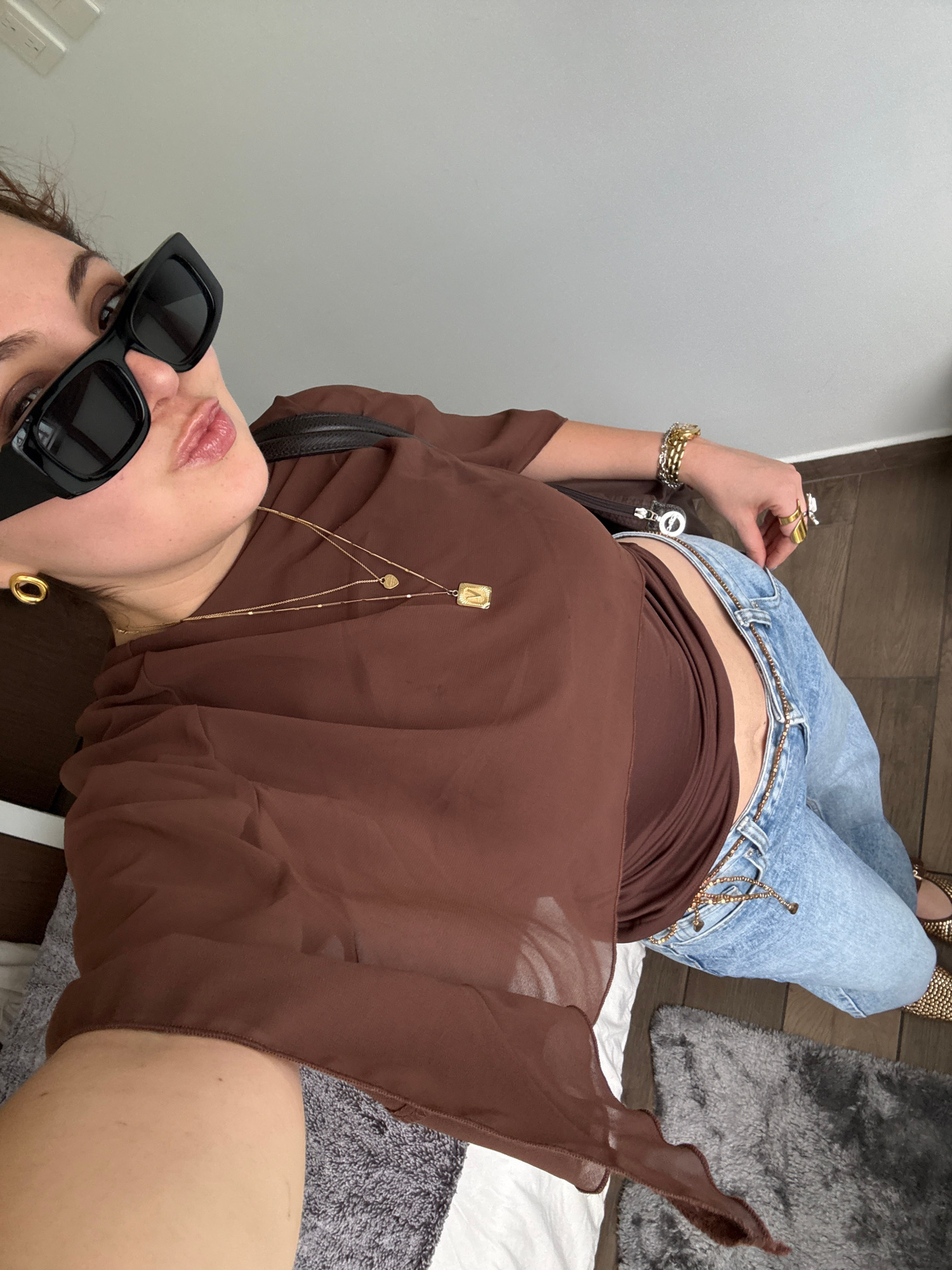 A person, likely female, is depicted from an upper-angle perspective, with the image oriented so they appear to be lying down. The person is wearing light-wash denim jeans with a gold chain belt, a br…read more