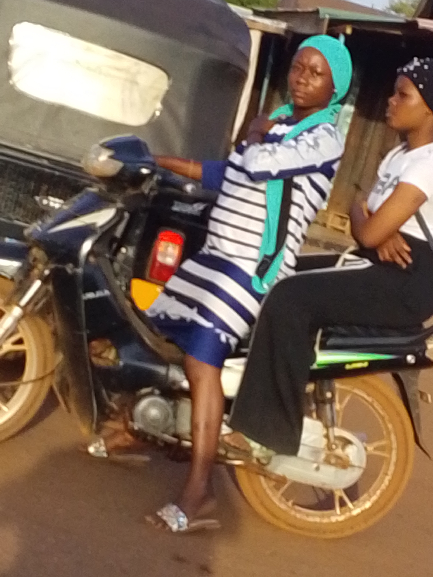 The image depicts two women and a motorcycle, with a partial view of a tricycle taxi (often called a "Mahama Camboo" or "yellow yellow" in Ghana) in the background. The setting appears to be an outdoo…read more