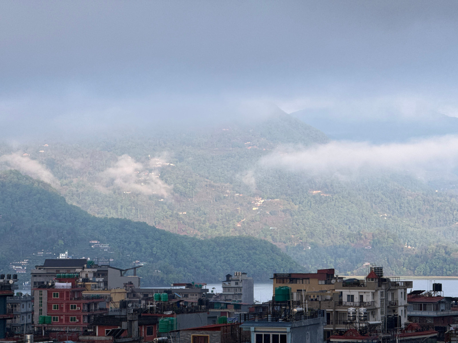 The image shows a hazy view of Pokhara, Nepal. In the foreground, there are densely packed buildings, varying in height and color, with numerous water tanks on the rooftops. In the background, there a…read more