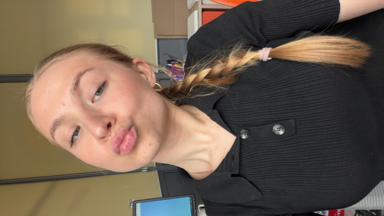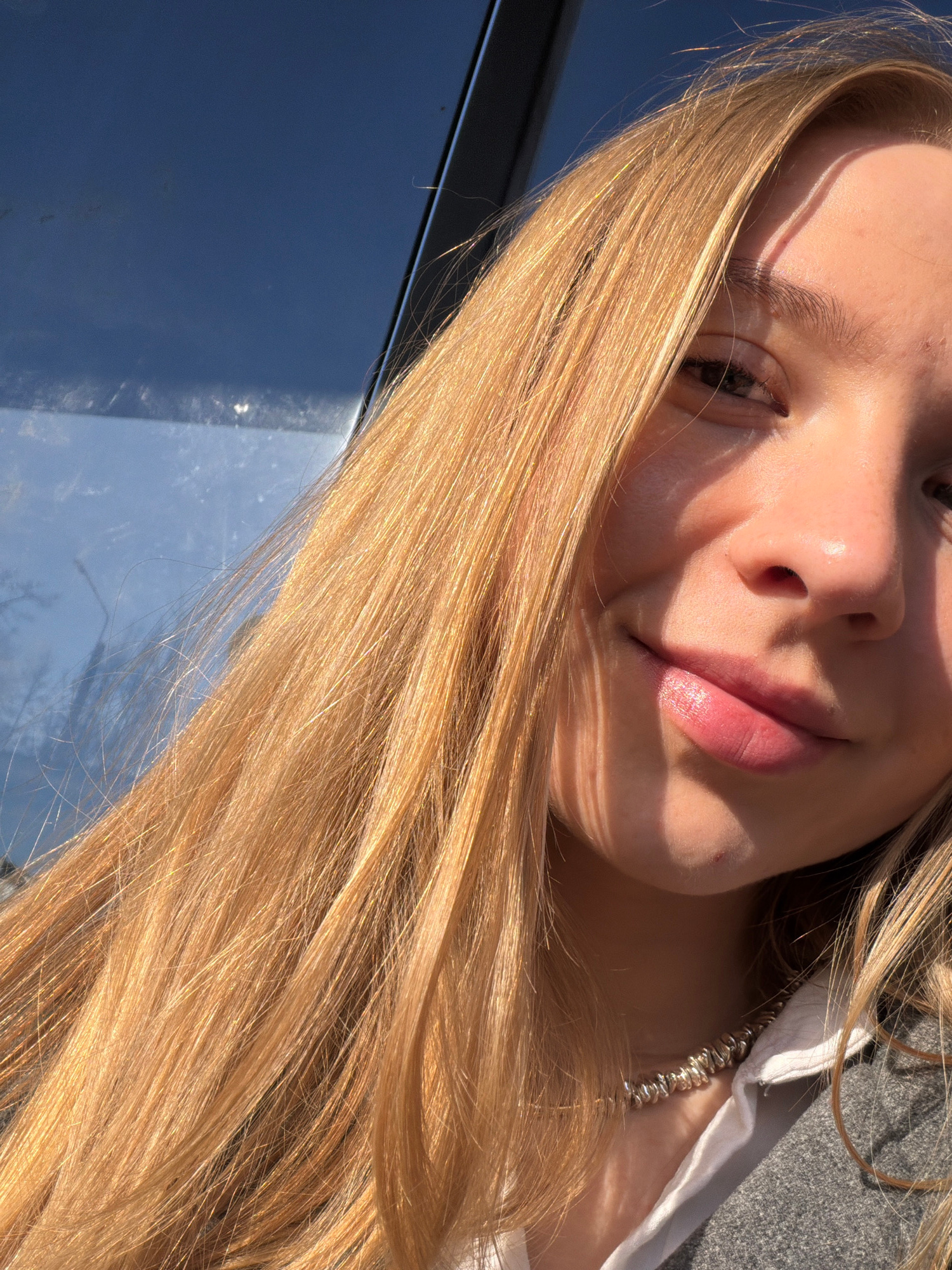 Close-up, tilted perspective of a fair-skinned person with long blonde hair, focusing on their face. The person is wearing a silver necklace, a white collared shirt, and a gray jacket. The background…read more