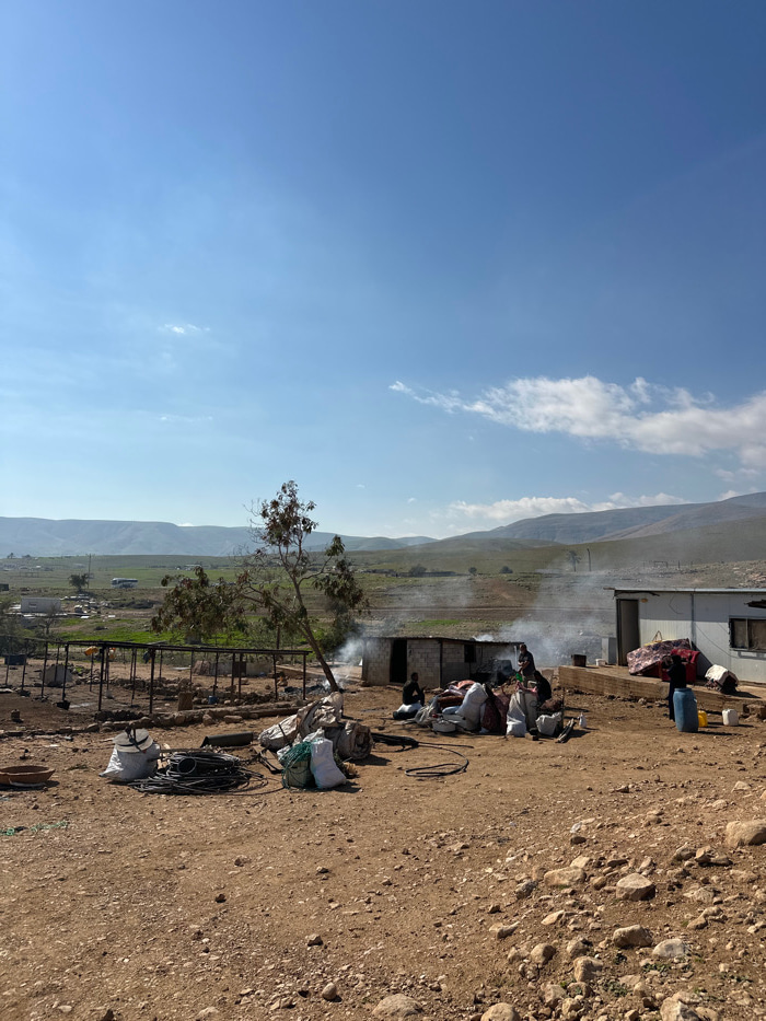 The image displays an arid outdoor environment in Ras 'Ein al 'Auja, Palestinian Territory, under a clear blue sky with minimal cloud cover. The foreground consists of dry, rocky, reddish-brown soil,…read more