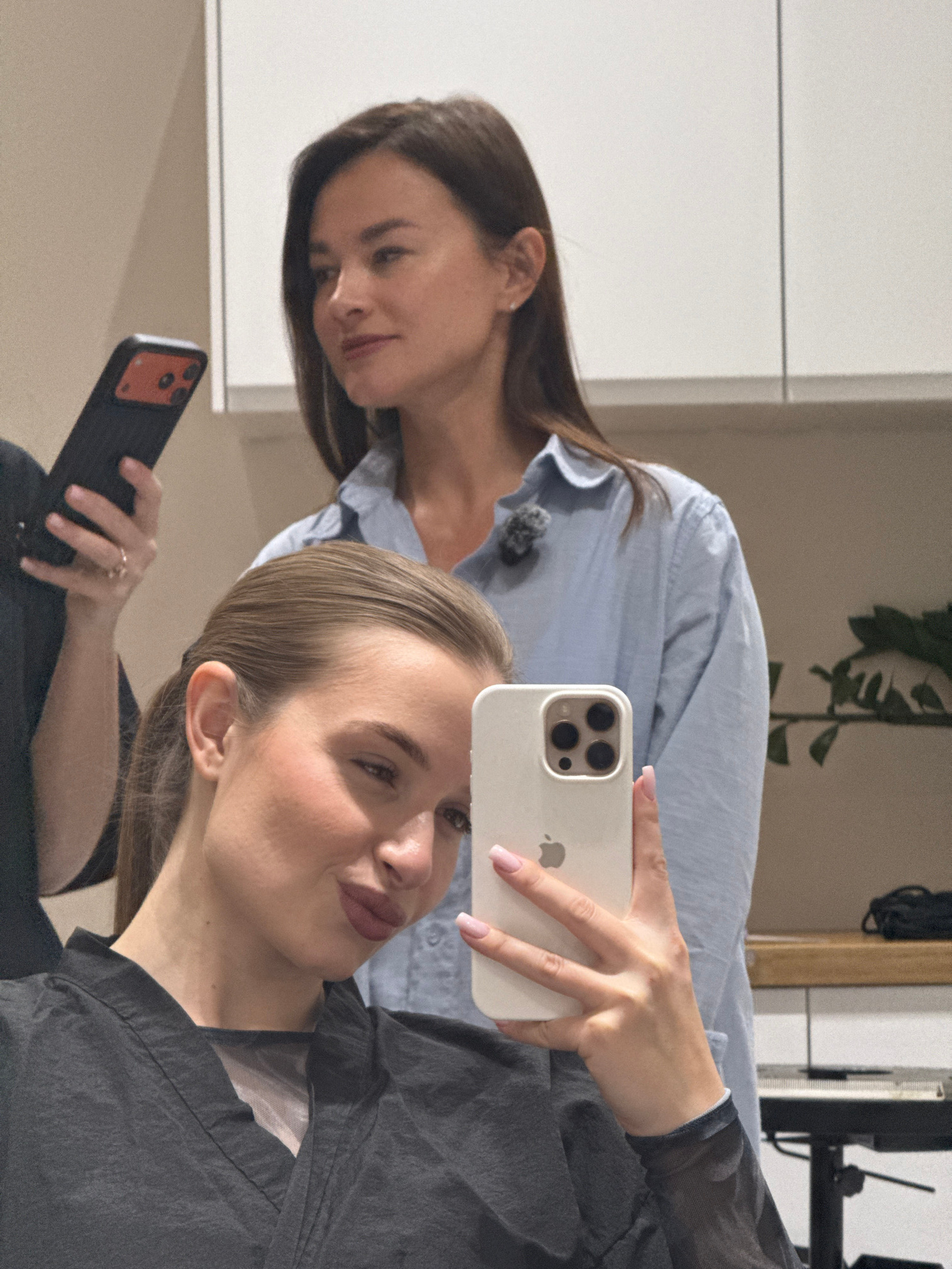 The image displays a mirror reflection of two women indoors in Budva, Montenegro. In the foreground, a woman with light brown hair, pulled back, takes a mirror selfie using a white iPhone. She holds t…read more