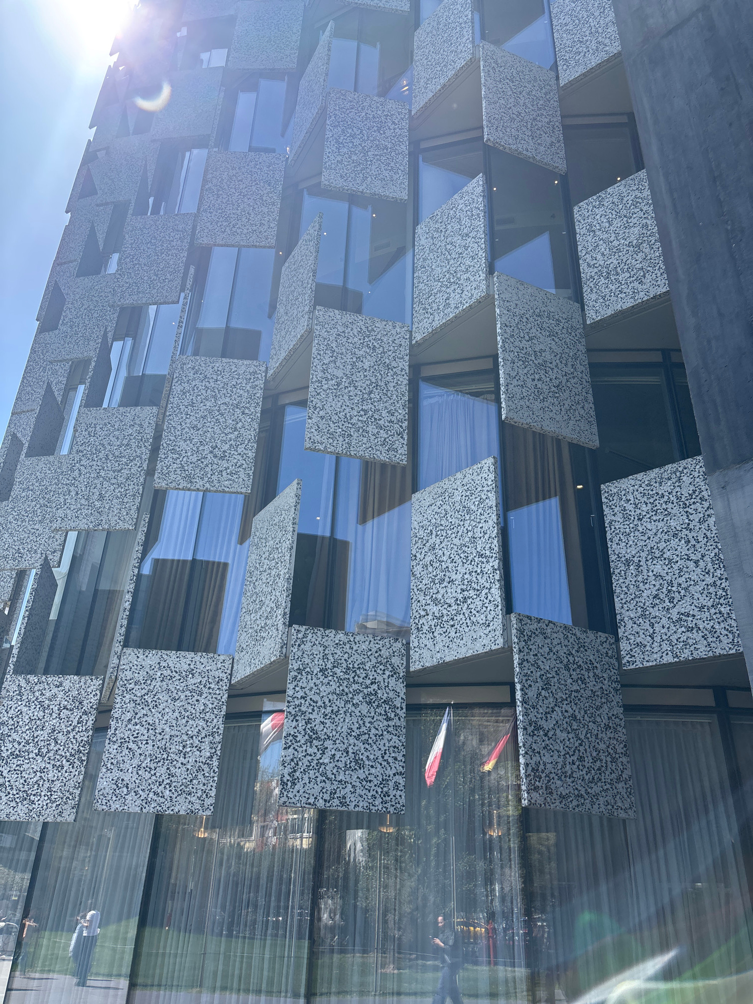 The image shows a building facade in Tirana, Albania. The facade is characterized by a pattern of square panels with a speckled gray and white texture, interspersed with windows. The panels are angled…read more
