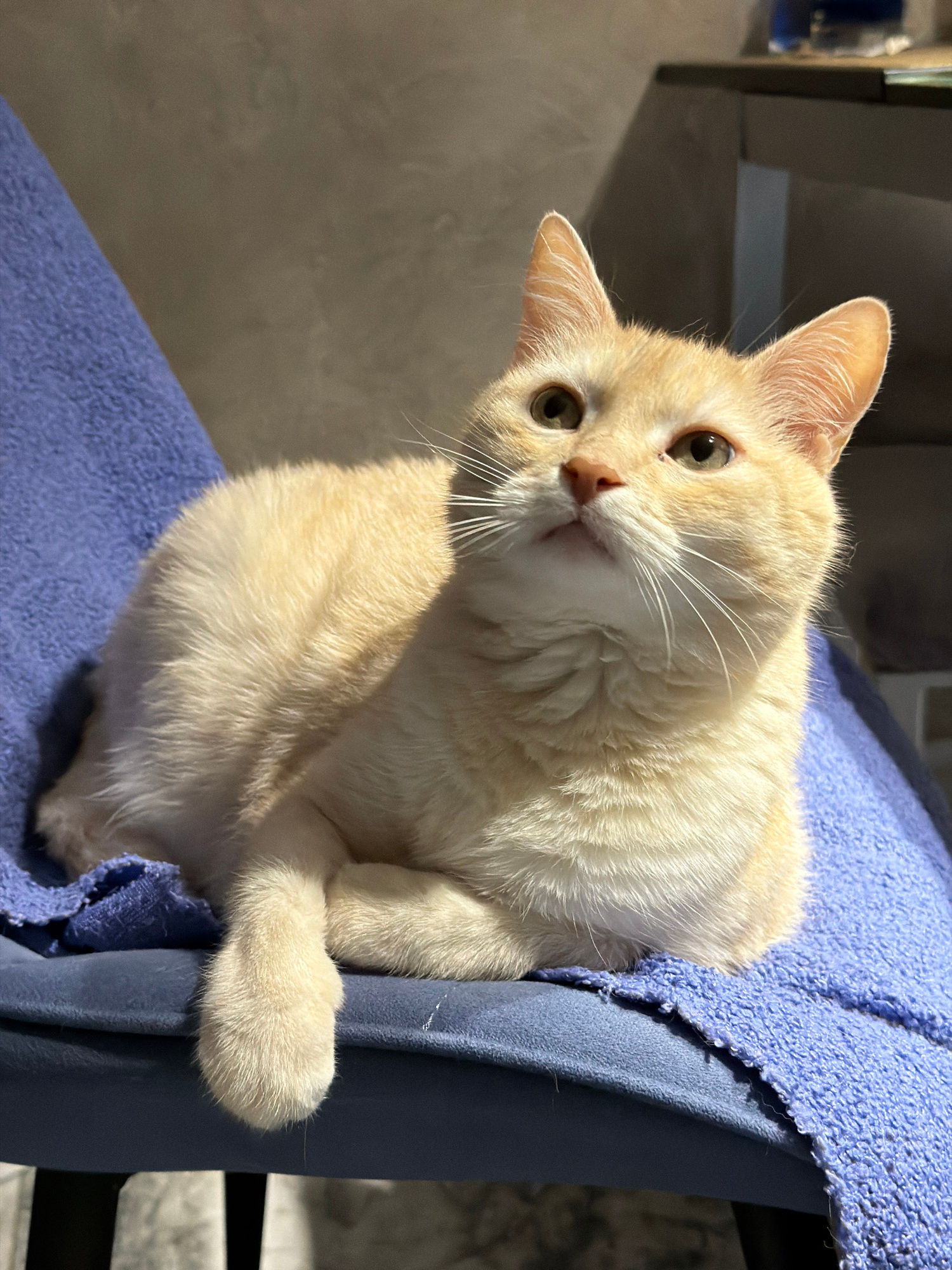 A light-colored cat is perched on a blue chair, angled slightly to the left. The cat is cream-colored with darker tan ears and hints of tan on its face. The cat has green eyes and prominent white whis…read more